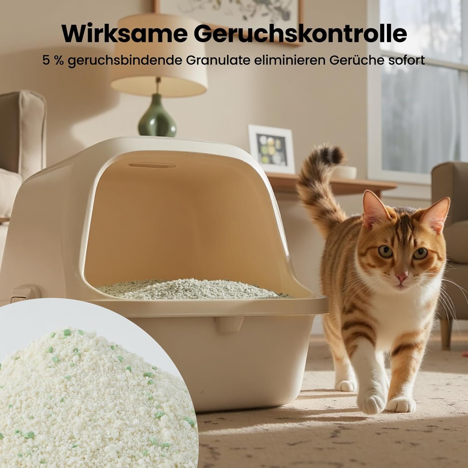 Geruchsneutralisierende Partikel: angereichert mit 5 % grünen desodorierenden Partikeln, die Gerüche einfangen und neutralisieren und so die Frische der Katzentoilette verlängern. Effektive Geruchsbeseitigung ohne aufdringliche Duftstoffe.