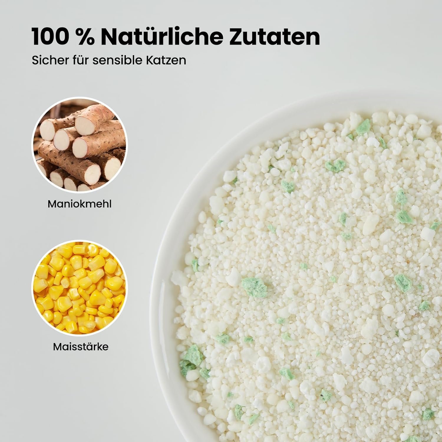 NATÜRLICHE PFLANZENFORMEL Dieses Katzenstreu besteht zu 100 % aus natürlichen Inhaltsstoffen – Tapiokastärke, Maisstärke und Maismehl – und ist daher umweltfreundlich und frei von chemischen Zusätzen, sodass es für Ihre Katze absolut sicher ist. Als erneuerbarer, pflanzlicher Rohstoff ist es eine sichere und nachhaltige Wahl sowohl für Ihren vierbeinigen Begleiter als auch für unseren Planeten.