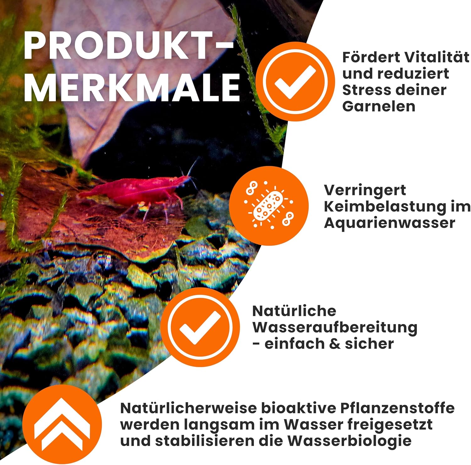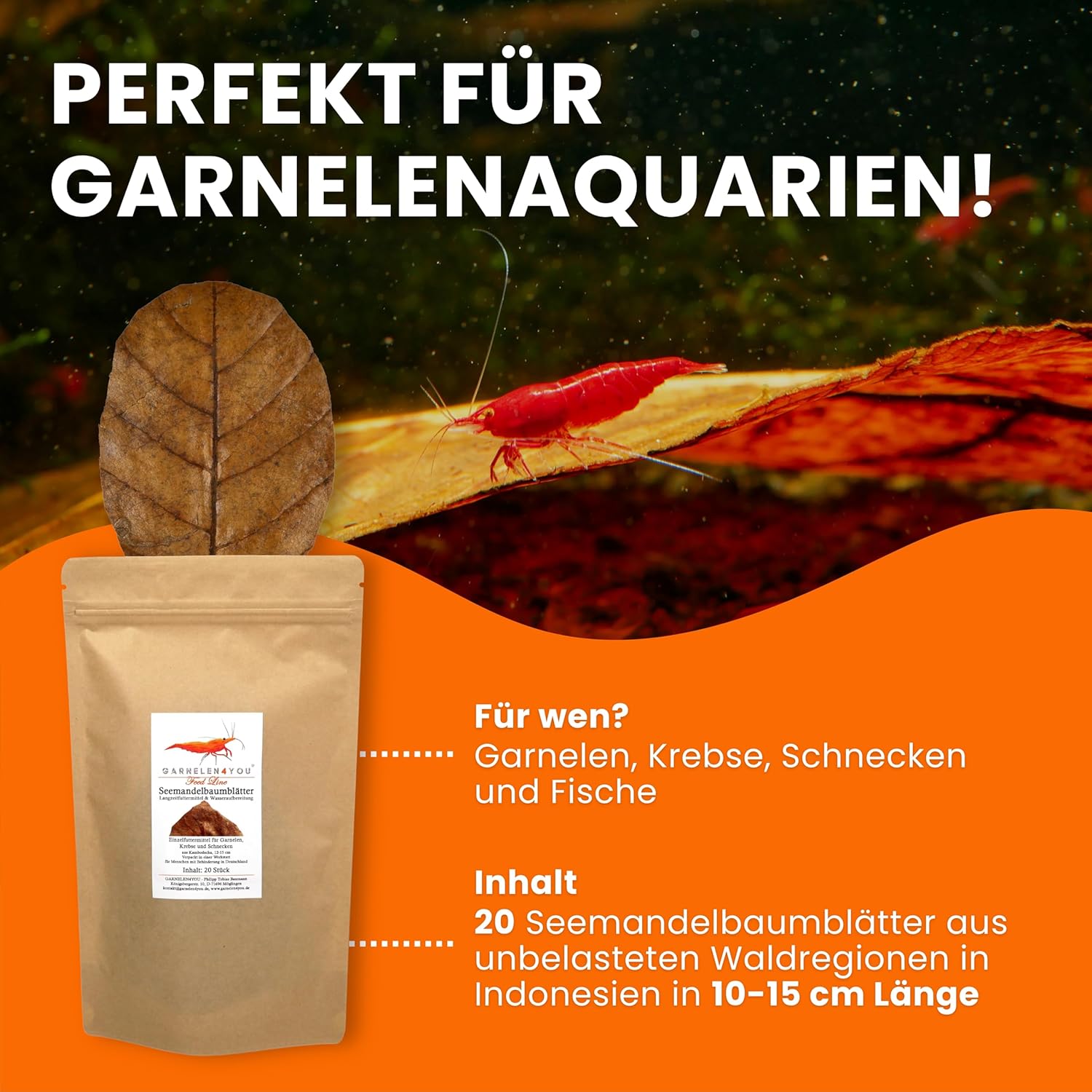 Beste Gesundheit und stabile Wasserbiologie – Seemandelbaumblätter geben wertvolle, bioaktive Pflanzenstoffe (Huminsäuren, Flavonoide und Tannine, mit antibiotischen, antimykotischen, entzündungshemmenden und antioxidativen Eigenschaften) an das Wasser ab und tragen so aktiv zur Tiergesundheit und einem stabilen biologischen Gleichgewicht im Aquarium bei.