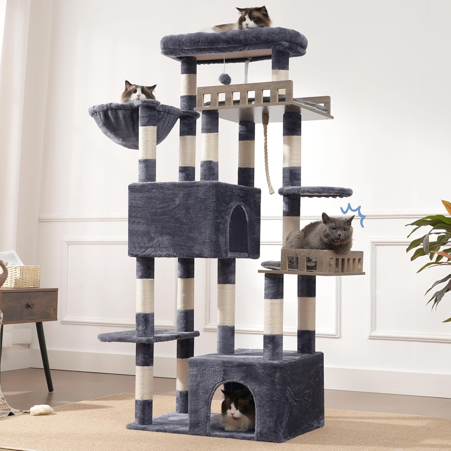 2 Holzstangen. Dieser hohe Kratzbaum ist speziell mit zwei Holzplattformen in unterschiedlichen Höhen ausgestattet, damit Katzen jeder Größe frei klettern können. Darüber hinaus bieten sie aber auch einen bequemen Platz zum Ausruhen