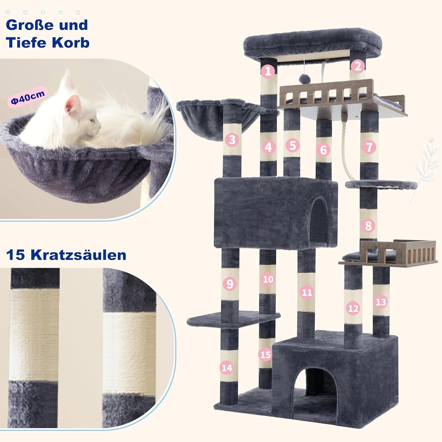 Kratzbaum mit 15 Stangen: Jeder Kratzbaum ist mit Sisalseil umwickelt, sodass Katzen jederzeit ihre Krallen schärfen können. Ausgestattet mit mehrstufigen Plattformen, die Katzen das mühelose Klettern und Springen erleichtern