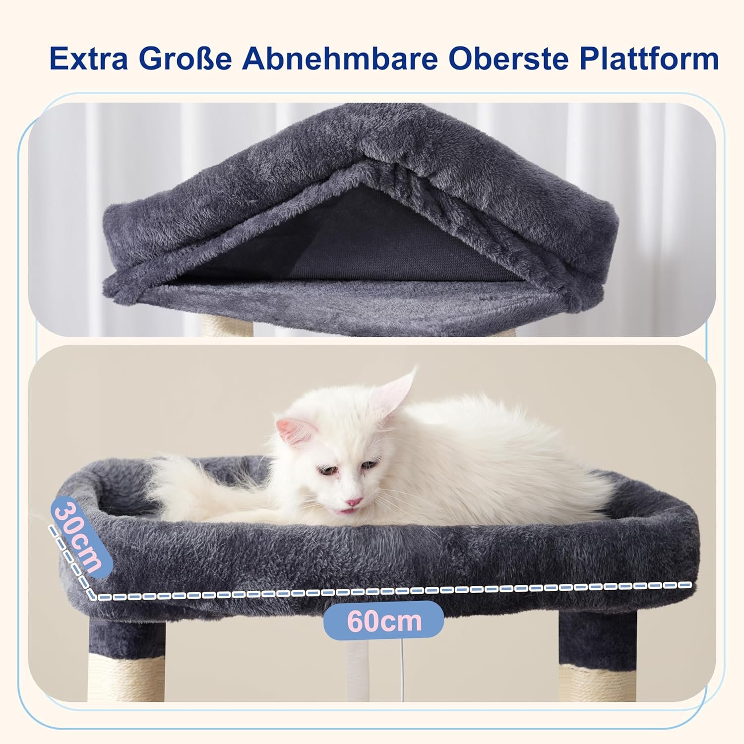 ABNEHMBARE OBERPLATTFORMEN Dieser große Kratzbaum mit oberen Plattformen (60 cm L × 30 cm B) ist für ausgewachsene Großkatzen, einschließlich Maine-Coon-Katzen, konzipiert. Dabei kann der Stoffbezug bei Bedarf abgenommen werden