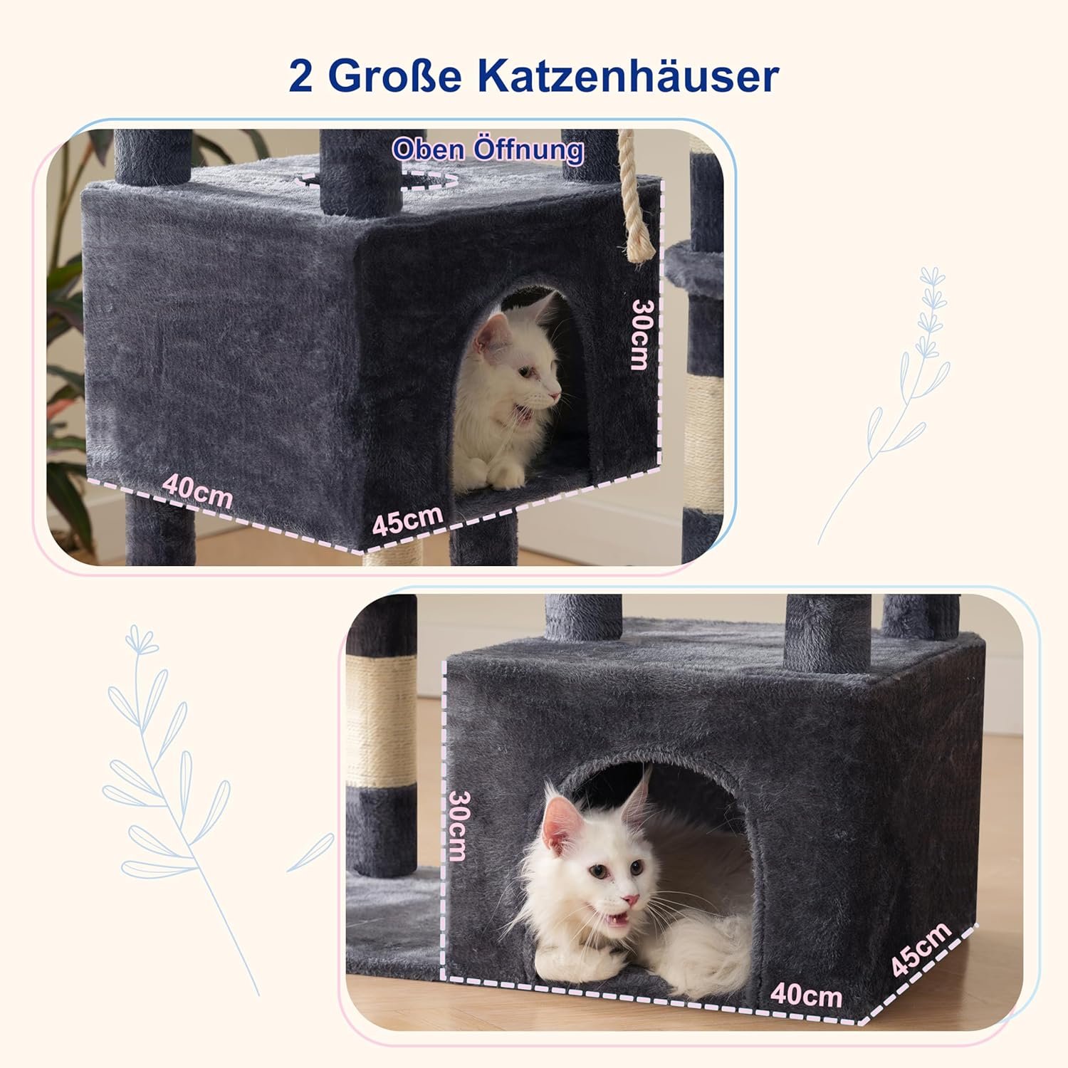 2 große Katzenhöhlen: Das geräumige Katzenhaus (40 cm L × 45 cm B) bietet Platz für mehrere Katzen zum gemeinsamen Ausruhen und sorgt gleichzeitig für optimale Abgeschiedenheit