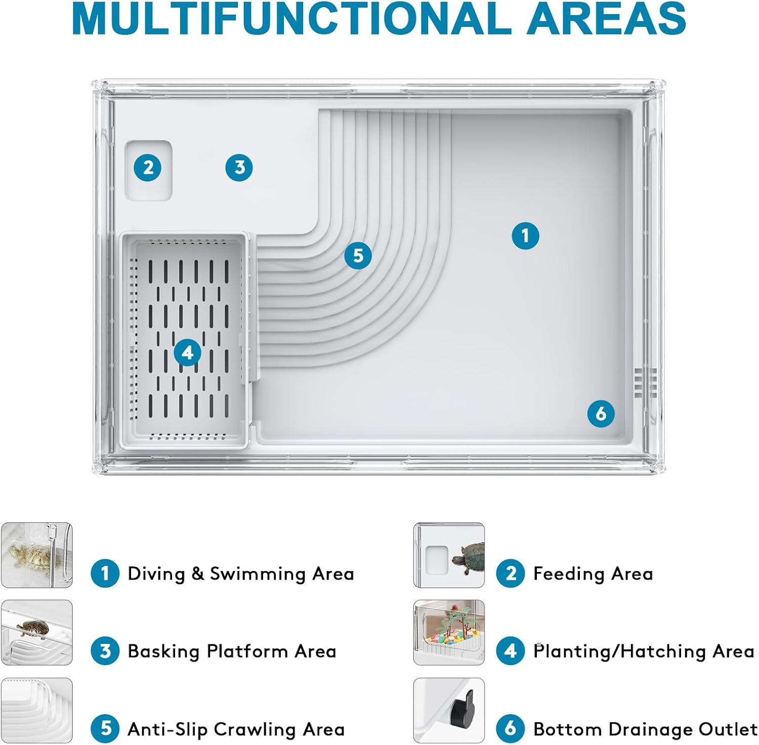 Einfache Installation: 4 Stück vollständig transparente Acrylplatten werden in den Kartensteckplatz eingesetzt und die Installation kann in nur einer Minute abgeschlossen werden; Dieses Aquarium ist 15,4 x 10,6 x 7,1 Zoll groß; Maximaler Wasserstand: 2,5 Zoll, geeignet für Reptilien innerhalb von 2,5 Zoll
