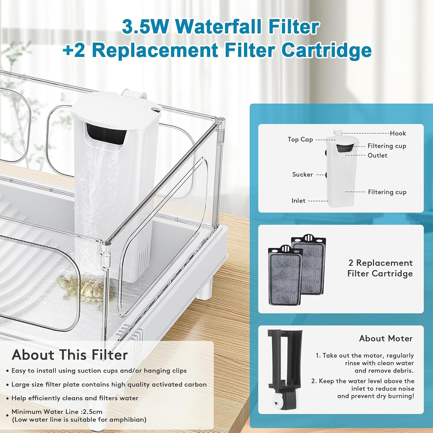 MIT LICHT UND FILTER Dieser Schildkröten-Lebensraum ist mit Licht und Filter ausgestattet, um Ihrem Haustier einen gesunden Lebensraum zu bieten. Befestigen Sie das Licht direkt am Tank und sorgen Sie für tägliche UV-Absorption für Schildkröten. Der Filter hilft beim Wassertreiben und hält das Wasser sauber