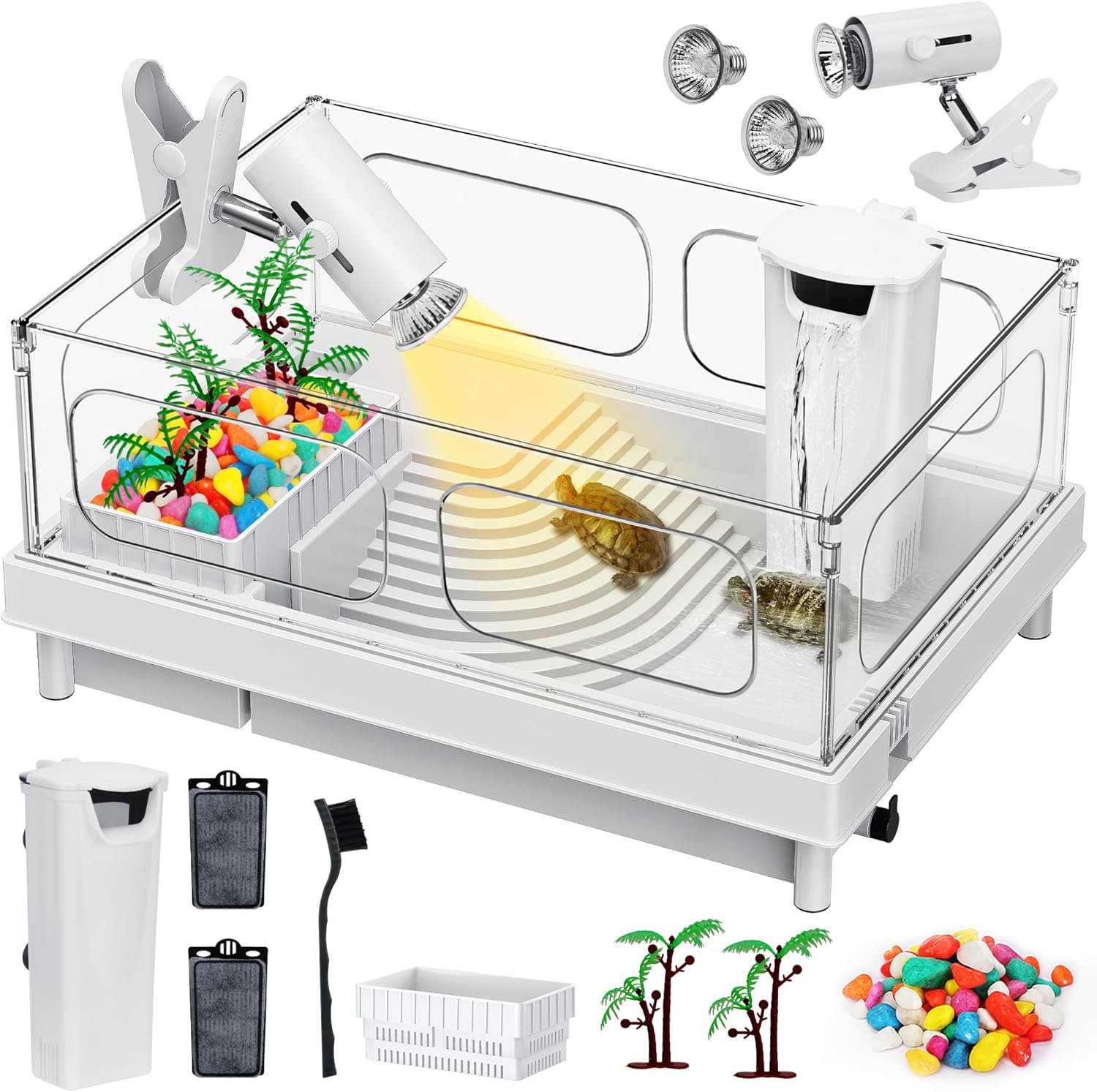 SCHILDKRÖTENBEHÄLTER-SET Unser Starterset für kleine Schildkröten besteht aus allem, was Sie brauchen, einschließlich 1 Schildkrötenbecken, 1 Lampe, 1 Filter, 1 Bürste, 2 kleinen Grünpflanzen und 1 Packung farbiger Steine. Geeignet für Babyschildkröten, Krabben und andere kleine Reptilien im Umkreis von 2,5 Zoll