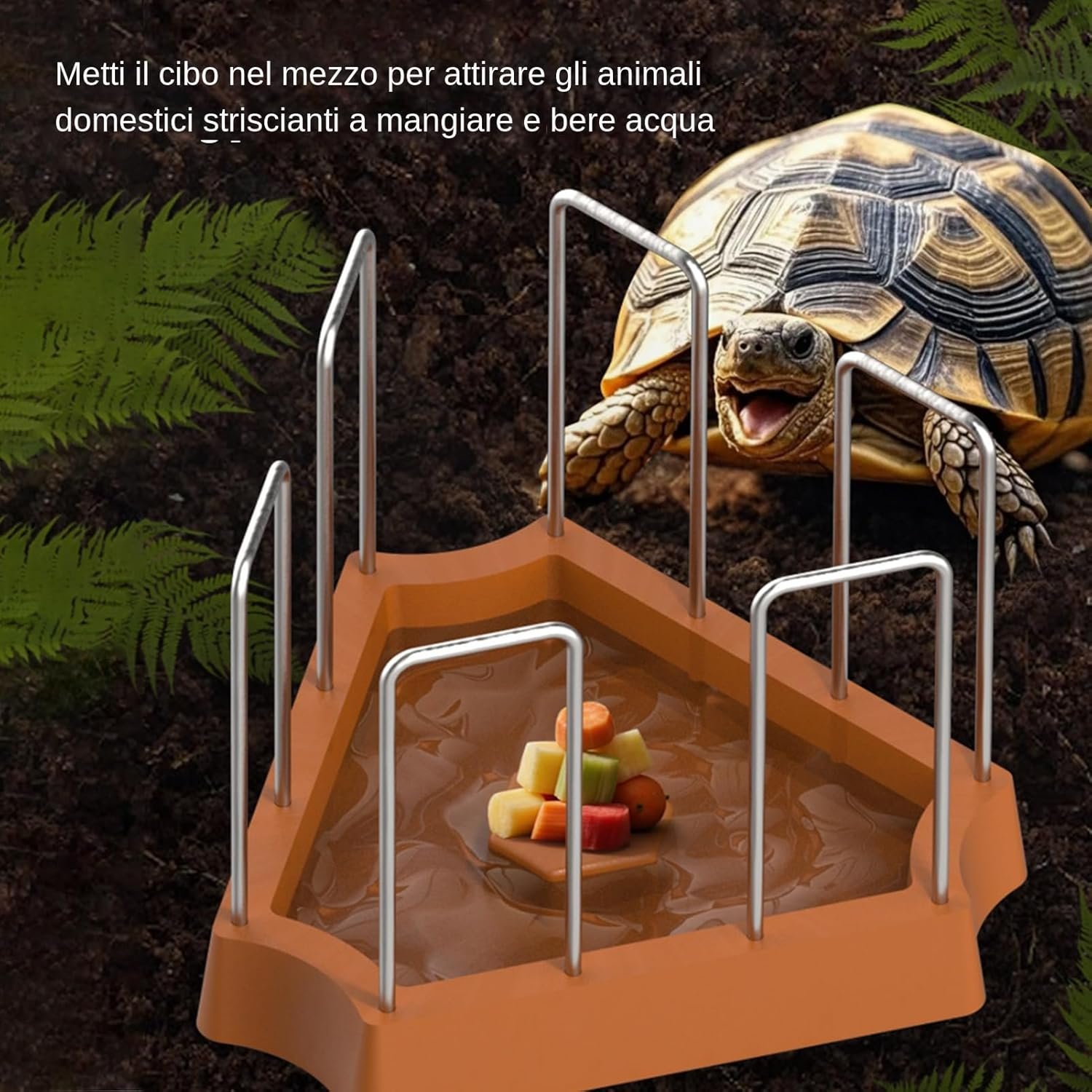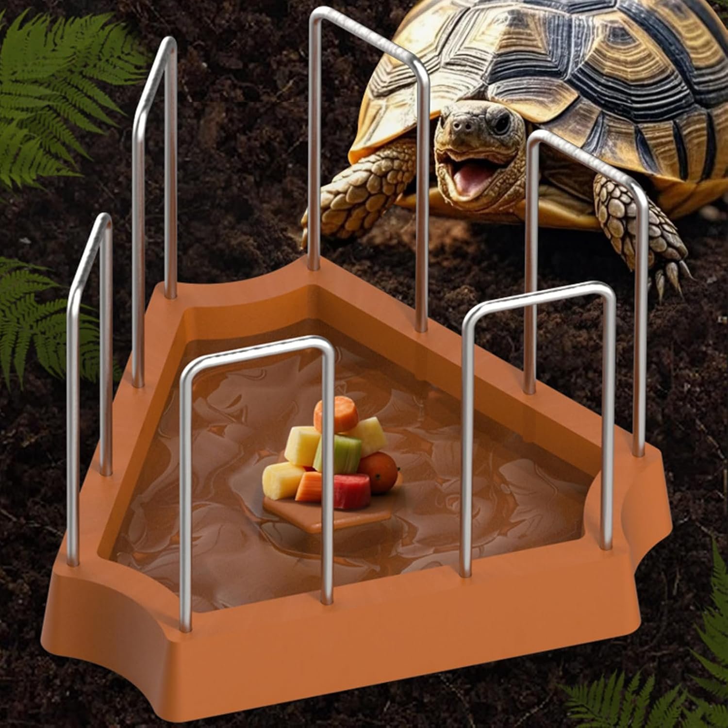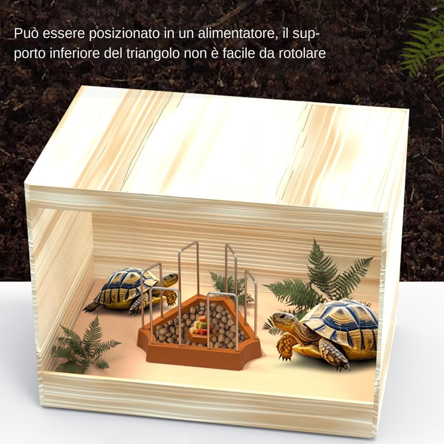 SCHILDKRÖTENFREUNDLICHE FÜTTERUNGSLÖSUNG Eine gut durchdachte dreieckige Struktur in Kombination mit einem geeigneten Zaun sorgt dafür, dass der Futterautomat sauber und hygienisch bleibt und Probleme wie das Ausgraben von Futter und unerwünschte Spritzer vermieden werden