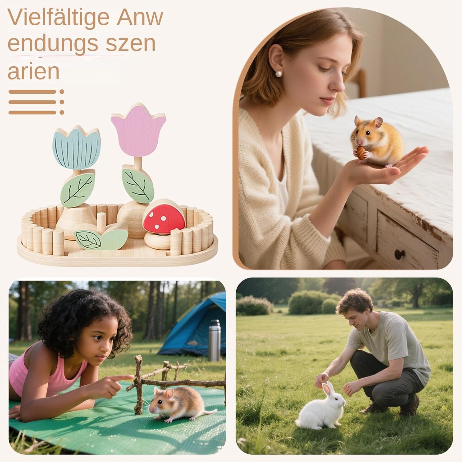 Verspielter Lebensraum: Hamsterspielzeug mit pastoralen Blütenelementen und Gartendesign schafft eine anregende Umgebung. Es fördert die natürliche Neugier des Tieres und dient als erkundungsfördernde Miniaturlandschaft in natürlicher Holzoptik.