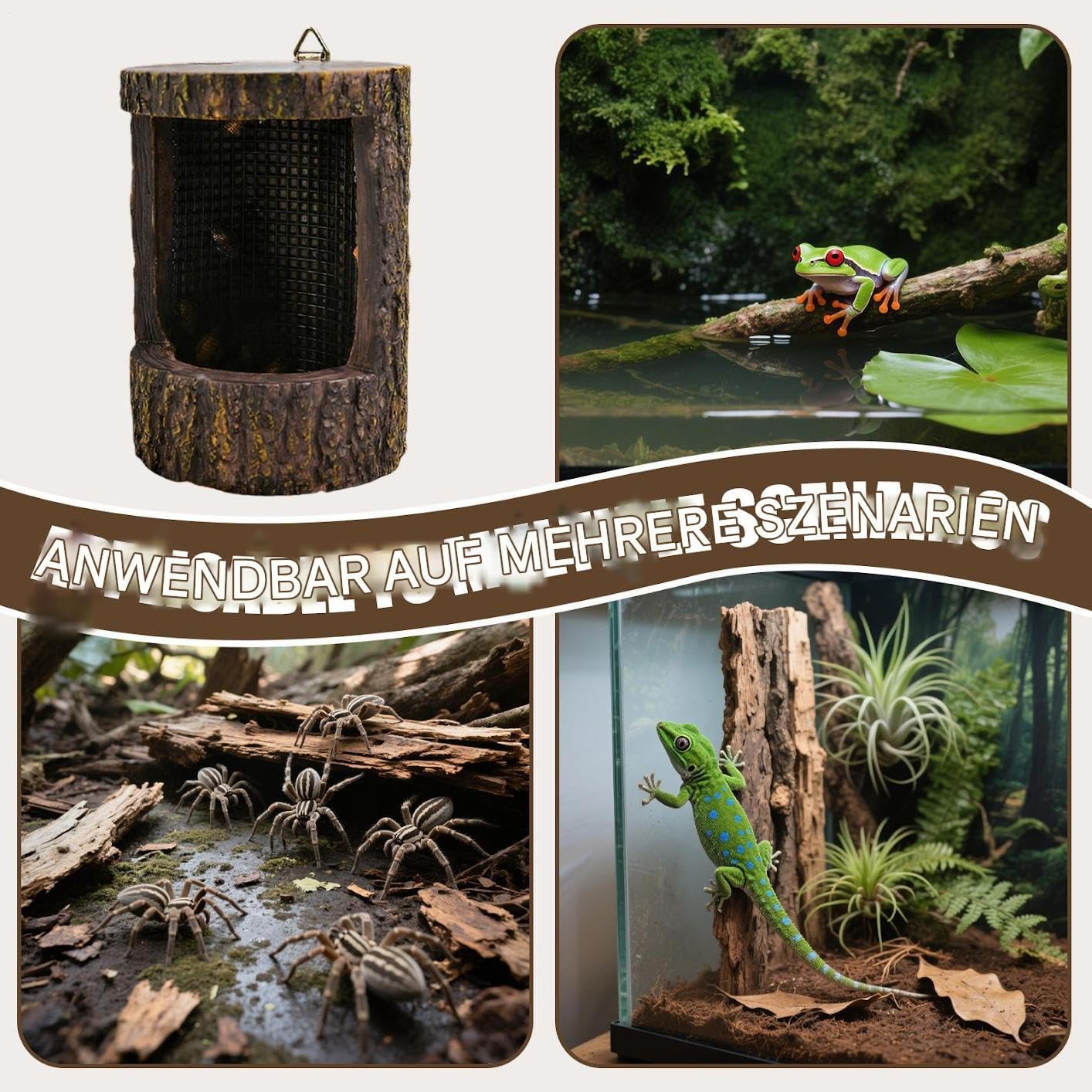 Natürliches Design: Der Reptilienfütterer besticht durch eine realistische Rindenstruktur und ein naturgetreues Baumstumpf-Design, das einen natürlichen Futterplatz schafft. Dies fördert das natürliche Fressverhalten Ihrer Tiere und fügt sich nahtlos in die Terrarium-Dekoration ein, für ein authentisches Habitat-Gefühl. Die erdtonfarbene Optik unterstreicht die naturgetreue Wirkung.