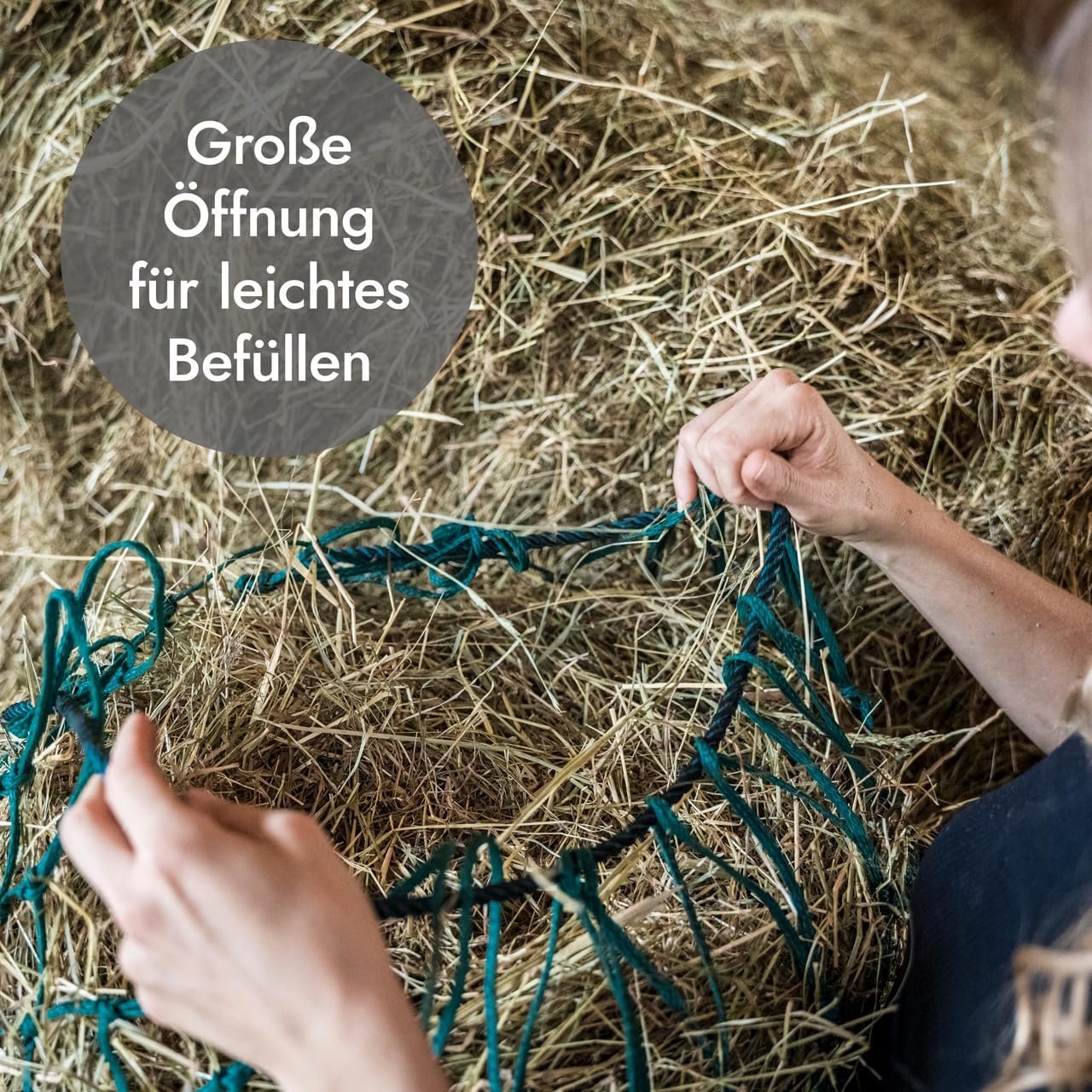 Große Öffnung mit Farbkontrast der Kordel. Wir wissen: Heunetz befüllen ist immer so eine Sache. Hier ist das Befüllen so einfach, dass selbst ein tollpatschiges Einhorn es beim ersten Versuch schaffen würde.