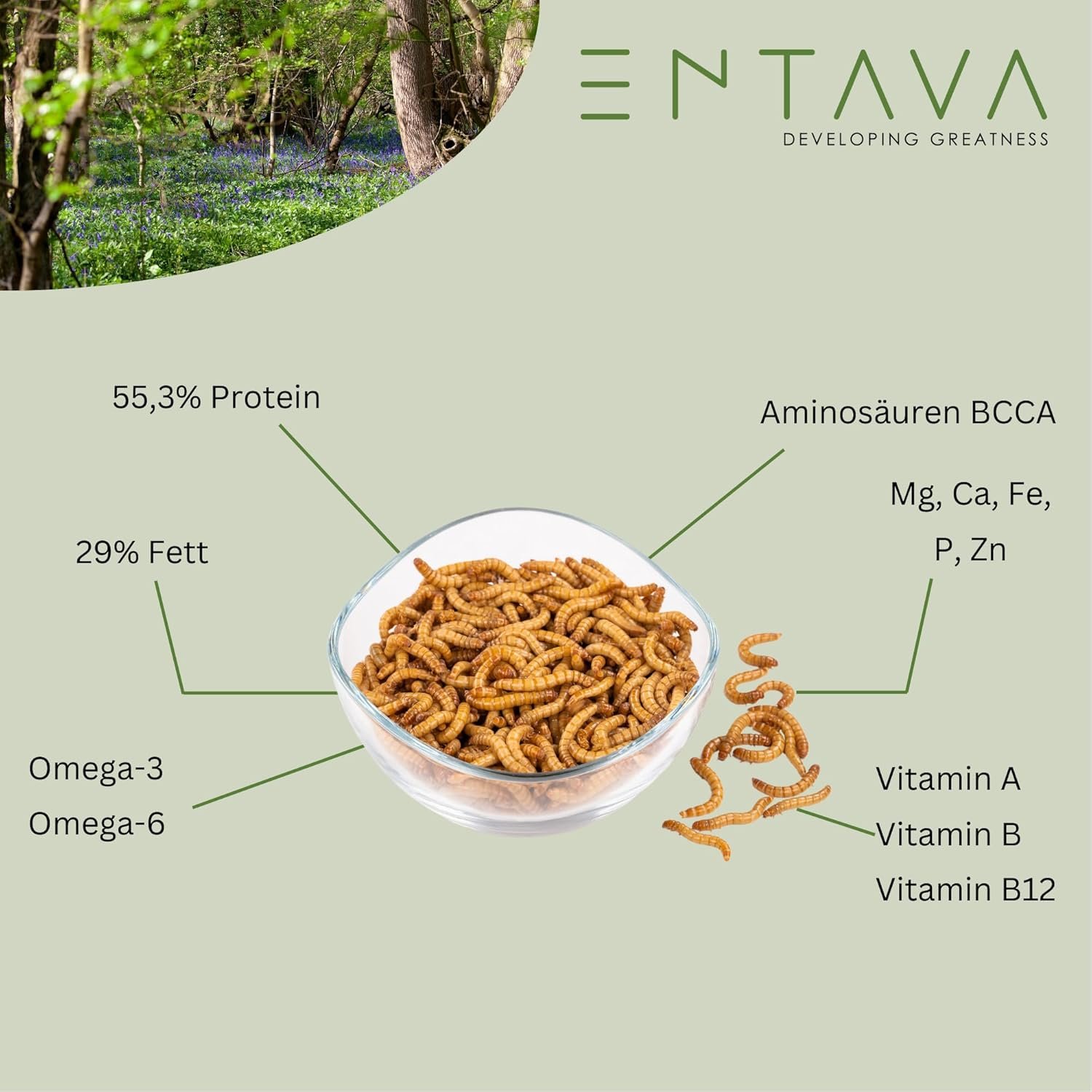 Premium-Qualität: Unsere getrockneten Mehlwürmer werden nachhaltig angebaut und schonend verarbeitet. Höchste Qualität, Frische und eine zuverlässige Proteinquelle.