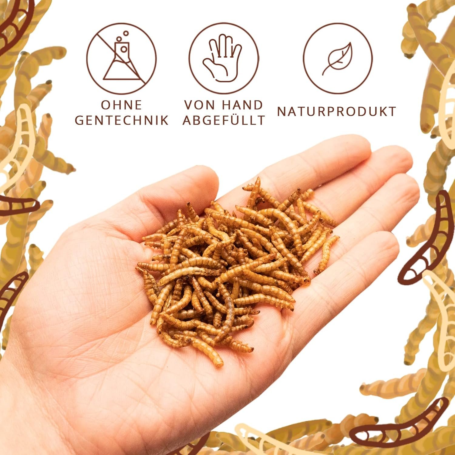 Unsere getrockneten Mehlwürmer werden sorgfältig von Hand gefüllt, sodass ein Bruch vermieden wird und Sie große, dicke Mehlwürmer und keine leeren Hülsen erhalten.