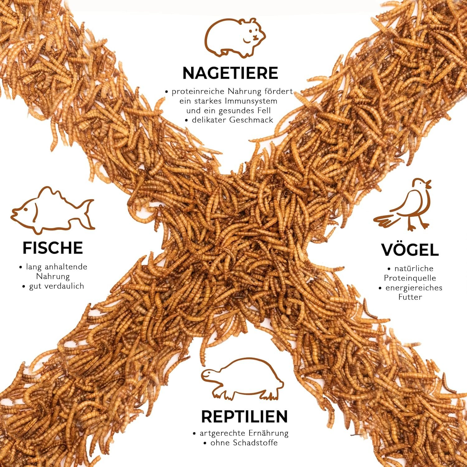 Getrocknete Mehlwürmer sind ein perfekter Energielieferant und versorgen Ihre Tiere mit vielen Proteinen, wichtigen Nährstoffen und Vitaminen, die durch den schonenden Trocknungsprozess erhalten bleiben. Unsere Mehlwürmer sind ein reines Naturprodukt und frei von künstlichen Zusatzstoffen.