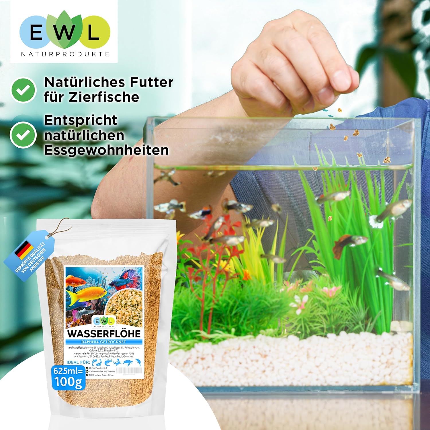 Qualität: Unsere Wasserflöhe werden besonders schonend getrocknet. Anschließend werden sie sorgfältig und bruchsicher verpackt.