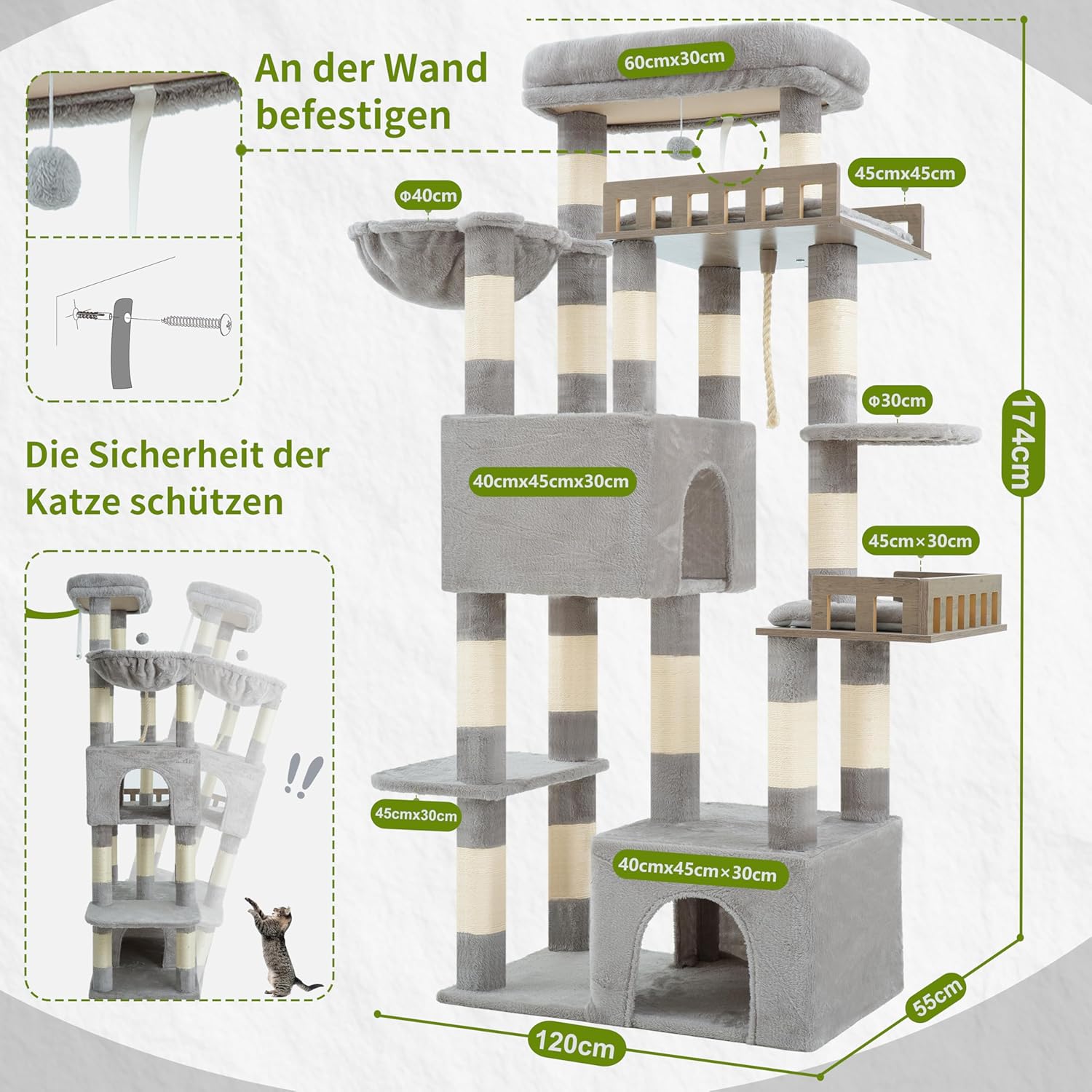 2 Holzstangen. Dieser hohe Kratzbaum ist speziell mit zwei Holzplattformen in unterschiedlichen Höhen ausgestattet, damit Katzen jeder Größe frei klettern können. Darüber hinaus bieten sie aber auch einen bequemen Platz zum Ausruhen