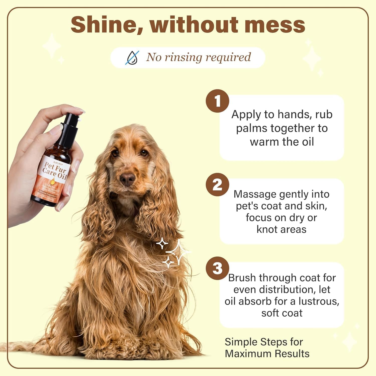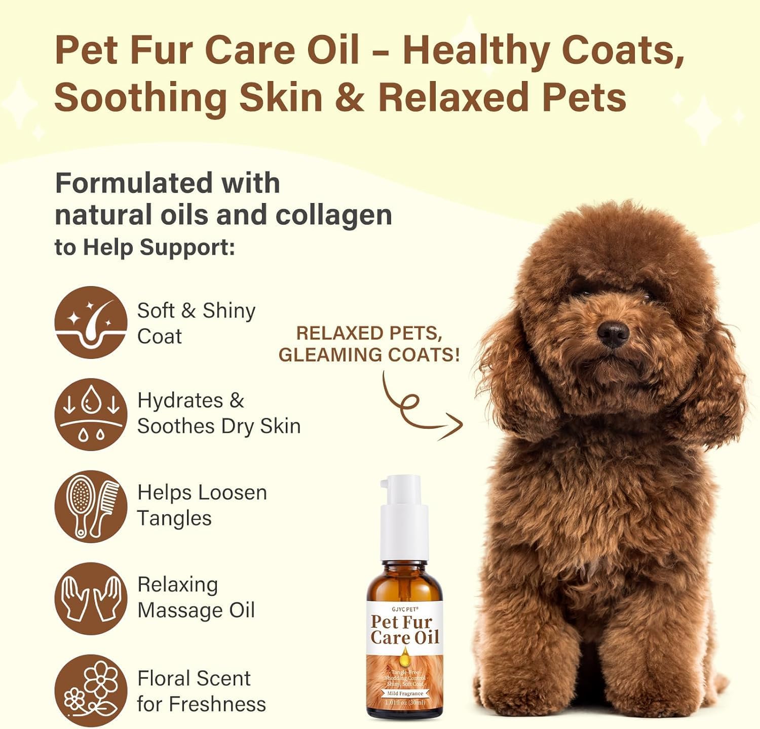 FEUCHTIGKEIT UND PFLEGE Unser Fellpflegeöl für Haustiere enthält Kollagen und eine Mischung aus hochwertigen natürlichen Ölen, darunter Jojobaöl und Olivenöl, um das Fell Ihres Haustieres intensiv mit Feuchtigkeit zu versorgen und zu pflegen. Diese leistungsstarke Kombination hilft, das Fell zu stärken und zu reparieren und spendet dauerhaft Feuchtigkeit und Nährstoffe.