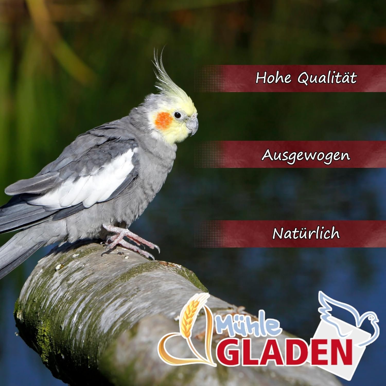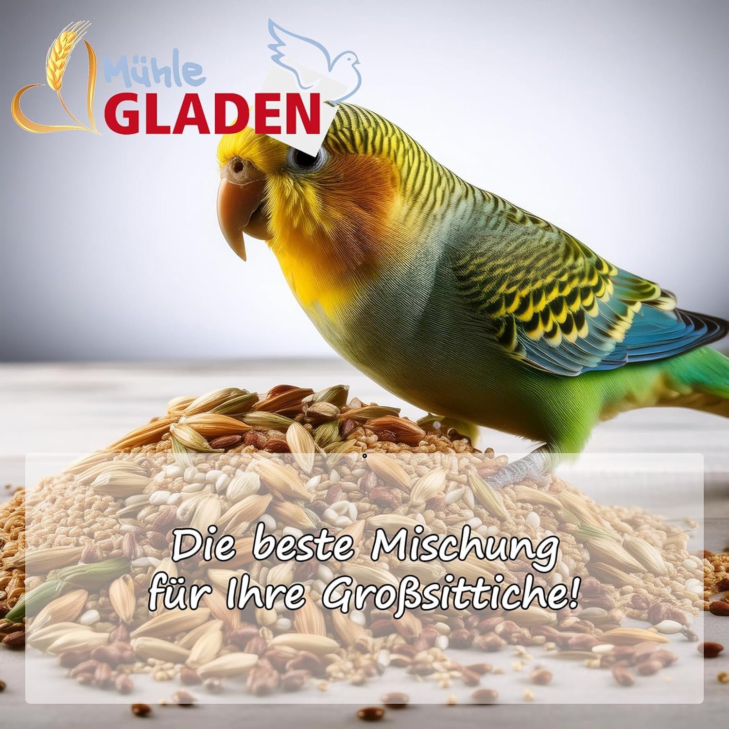 Großsittichfutter – Gladen 5 kg. Ein umfassendes und energiereiches Alleinfutter für Großsittiche und Nymphensittiche. Unser Gladen Großsittichfutter ist speziell auf die Ernährungsbedürfnisse von Großsittichen abgestimmt, insbesondere solchen, die ein aktives Leben mit viel Bewegung führen. Auch für Nymphensittiche geeignet. Diese sorgfältig zusammengestellte Mischung enthält eine Vielzahl an Samen und Körnern, die eine gesunde und abwechslungsreiche Ernährung fördern. HOHER ENERGIEGEHALT – Mit erhöhtem Anteil an gestreiften und weißen Sonnenblumenkernen, ideal für sehr aktive Vögel. Vielfältige Zusammensetzung: Enthält Kanariensaat, verschiedene Hirsearten, Hafersamen, Hanf, Rohreis, Cardissamen und Buchweizen. Ergänzbar: Kann mit Fuchsschwanzhirse, Früchten, Gemüse und Kräutern zur Bereicherung der Ernährung erweitert werden. Bereiten Sie Ihren Großsittichen und Nymphensittichen mit unserem Gladen Großsittichfutter eine optimale Ernährung zu, die nicht nur gesund ist, sondern auch das Wohlbefinden und die Lebensqualität Ihrer Vögel steigert. Fütterungs-/Anwendungshinweise: ca. 1 Esslöffel pro Tier und Tag, abhängig von der Größe und dem Energiebedarf des Tieres. Stellen Sie sicher, dass die Lebensmittel täglich frisch verfügbar sind. Ergänzen Sie die Ernährung Ihrer Vögel mit Vogelgrieß oder Magenkieseln für eine gute Verdauung sowie Sepiaschalen und Mineralsteinen, um den Mineralstoffbedarf sicherzustellen. Zusammensetzung: 20 % Str. Sonnenblumenkerne 10 % Weiße Sonnenblumenkerne 20 % Kanariensaat 15 % Hirse, Gelbe 10 % Haferkerne 10 % Hanf 10 % Rote Hirse 2 % Rohreis 2 % Kardissamen 1 % Buchweizen Futterart: Alleinfuttermittel Tierart/Tierkategorie: Ziervögel