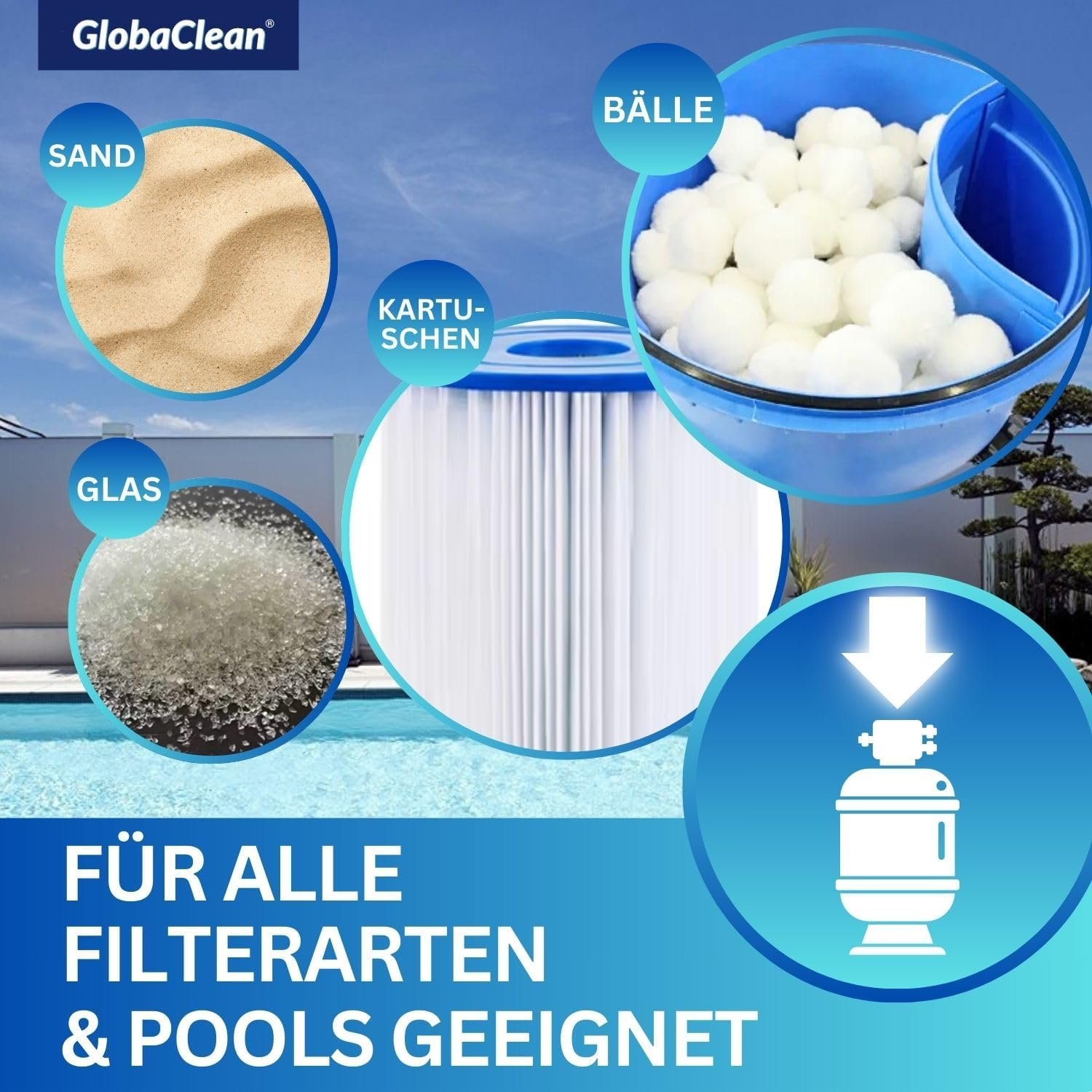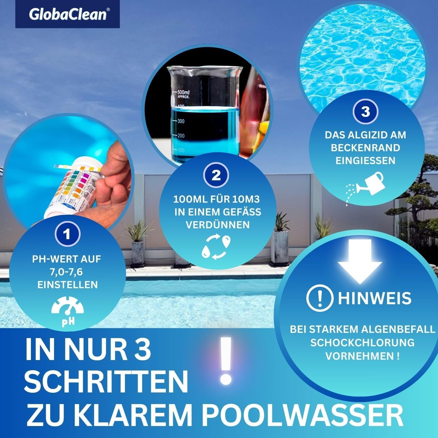 The pool water must be continuously circulated. To calculate the circulation time, the following rule of thumb applies: Water temperature: 2 = Circulation time per day. For heavy bathing, thunderstorms and higher temperatures, we recommend adding up to twice the usual dosage amount per week. In order to reliably prevent algae growth, GlobaClean algae preventive must be dosed regularly once a week from the beginning of the season to the end.