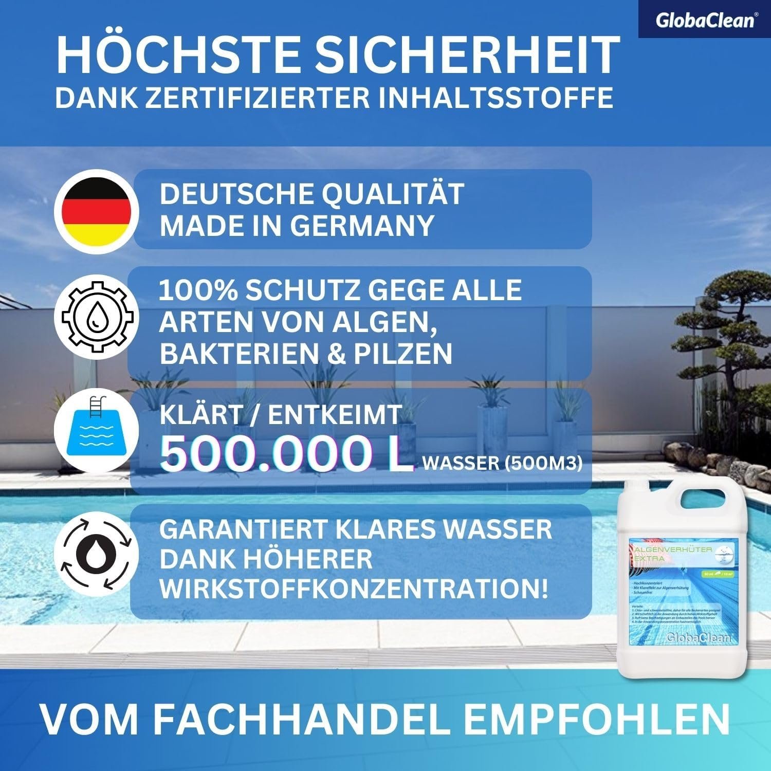 With our pool algae killer, quickly and reliably prevent algae and germs.