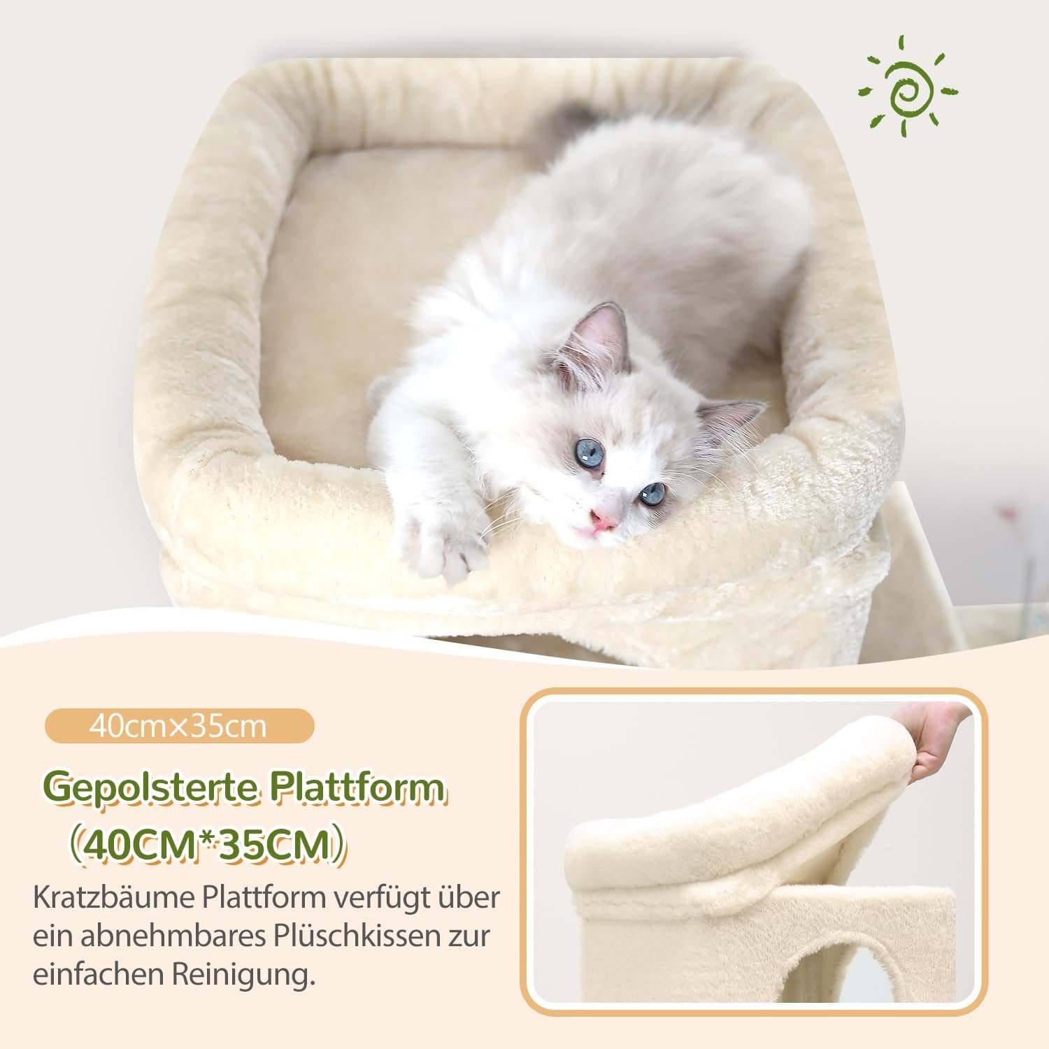 GROSSE GEPOLSTERTE PLATTFORM – Die Oberseite des Kratzbaums verfügt über eine große, dick gepolsterte Plattform (40 x 35 cm), die sich ideal zum Ausruhen großer Katzen eignet. Das Plüschkissen ist zur einfachen Reinigung abnehmbar.