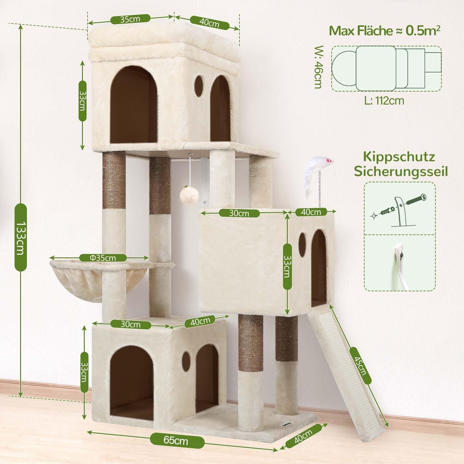 Kratzbaum mit 3 großen Katzenhäusern: Der Kratzbaum verfügt über drei große Katzenhöhlen. Die beiden unteren Höhlen haben die Maße 40 x 33 x 30 cm, das obere Katzenhaus 40 x 33 x 35 cm. Der Kratzbaum ist für 2-4 Katzen geeignet.