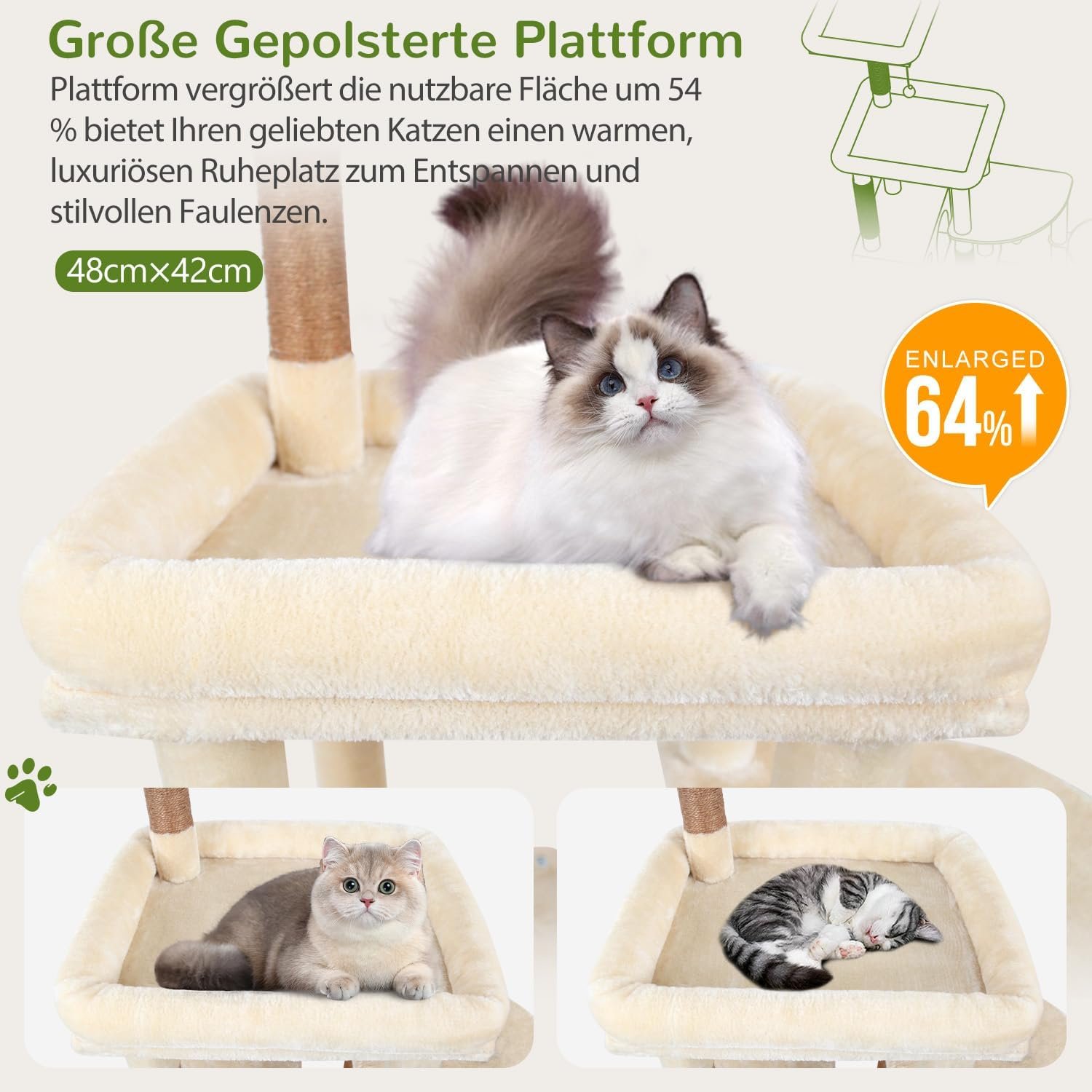 Große gepolsterte Plattform: Der Kratzbaum verfügt über eine 48 x 42 cm große gepolsterte Plattform. Die weiche Plattform vergrößert die Liegefläche um 64 %. Diese große Plattform ist ideal für Großkatzen zum Entspannen und Beobachten.