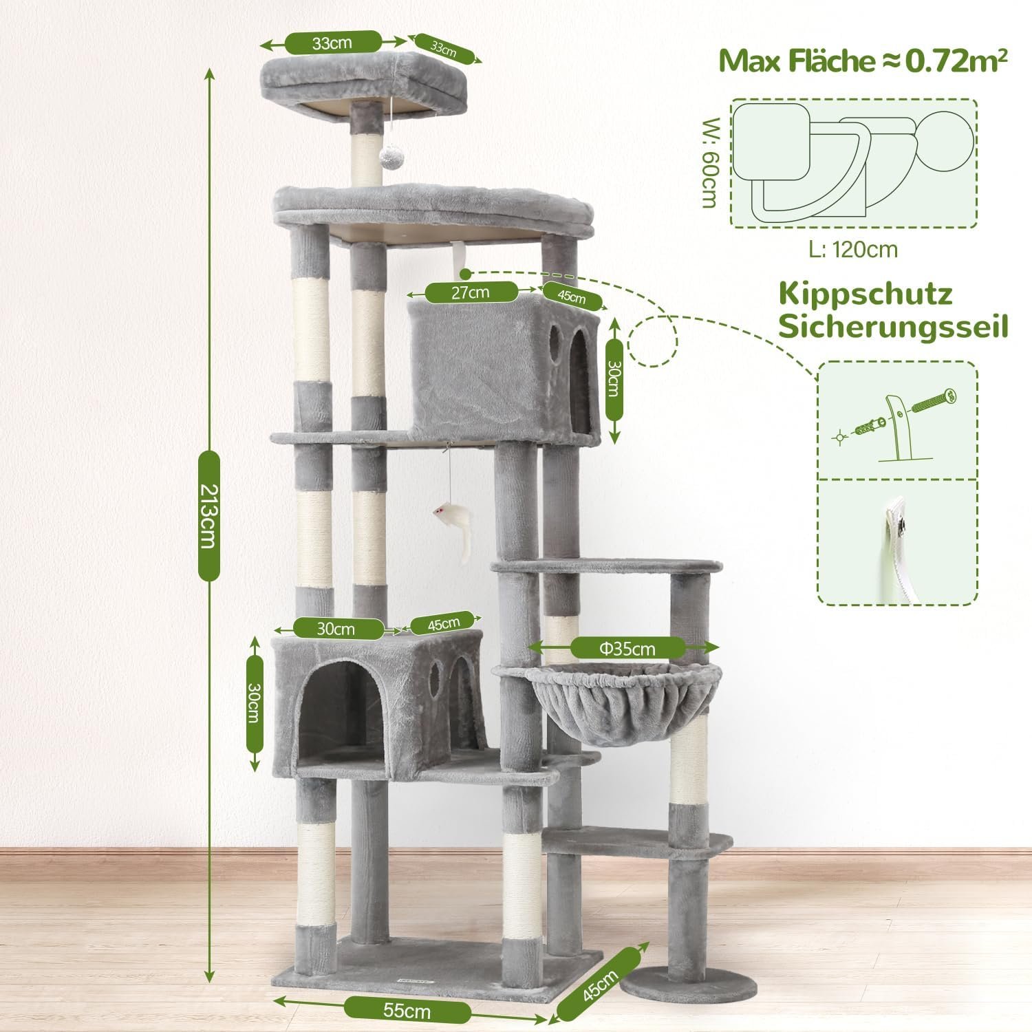 Großer Kratzbaum über 2 Meter: Dieser extra große Kratzbaum XXL ist 213 cm hoch und bietet mit seinen mehreren großen Liegeflächen mehr Bewegungsfreiheit als andere Kratzbäume. Es ist speziell für große Katzen mit einem Gewicht von 7 kg konzipiert. Entwickelt für Katzen ab 7 kg.
