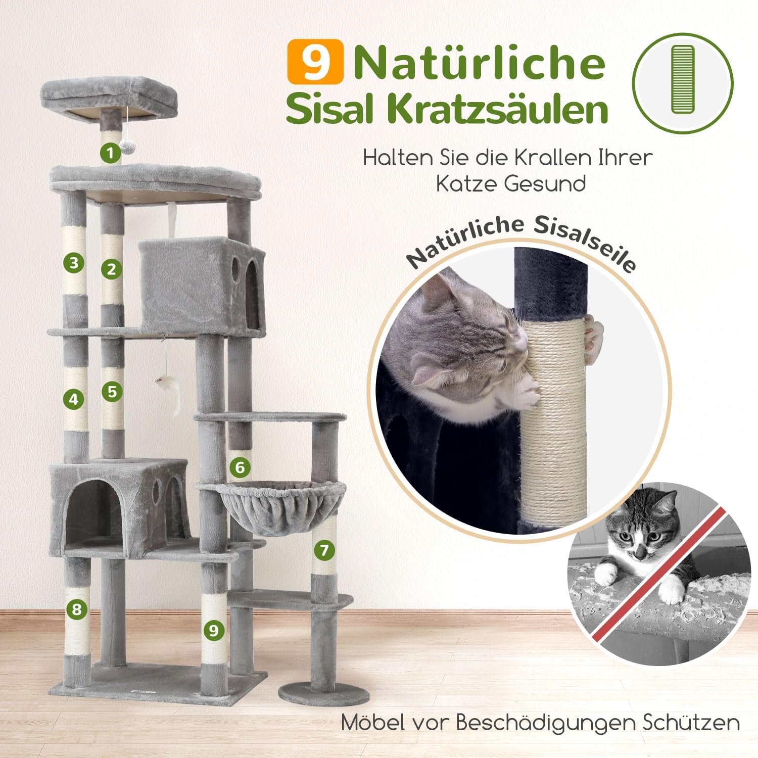 Geeignet für Haushalte mit mehreren Katzen: Der Kratzbaum wird mit mehreren Höhlen, Plattformen, Liegen, Sisal-Kratzstämmen, Katzenplüschtieren und mehr geliefert. Es kann von 4–5 Katzen gleichzeitig genutzt werden, so dass auch eine Familie mit mehreren Katzen harmonisch zusammenleben kann.