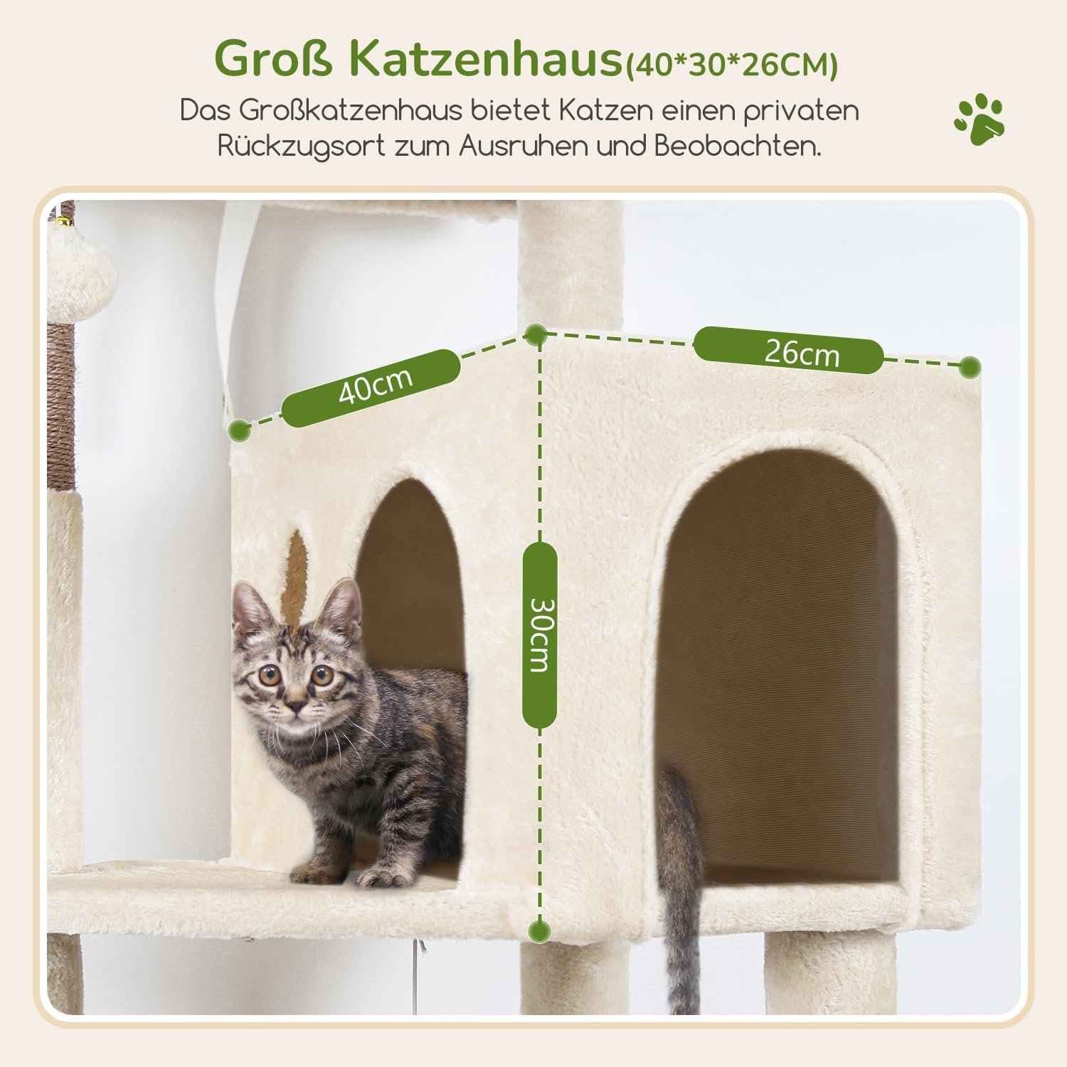 Geräumiges Katzenhaus. Der Kratzbaum wird mit einem großen Katzenhaus (40 x 30 x 27 cm) geliefert. Der geräumige Innenraum des Katzenhauses bietet erwachsenen Katzen ausreichend Platz zum Verstecken und Ausruhen.