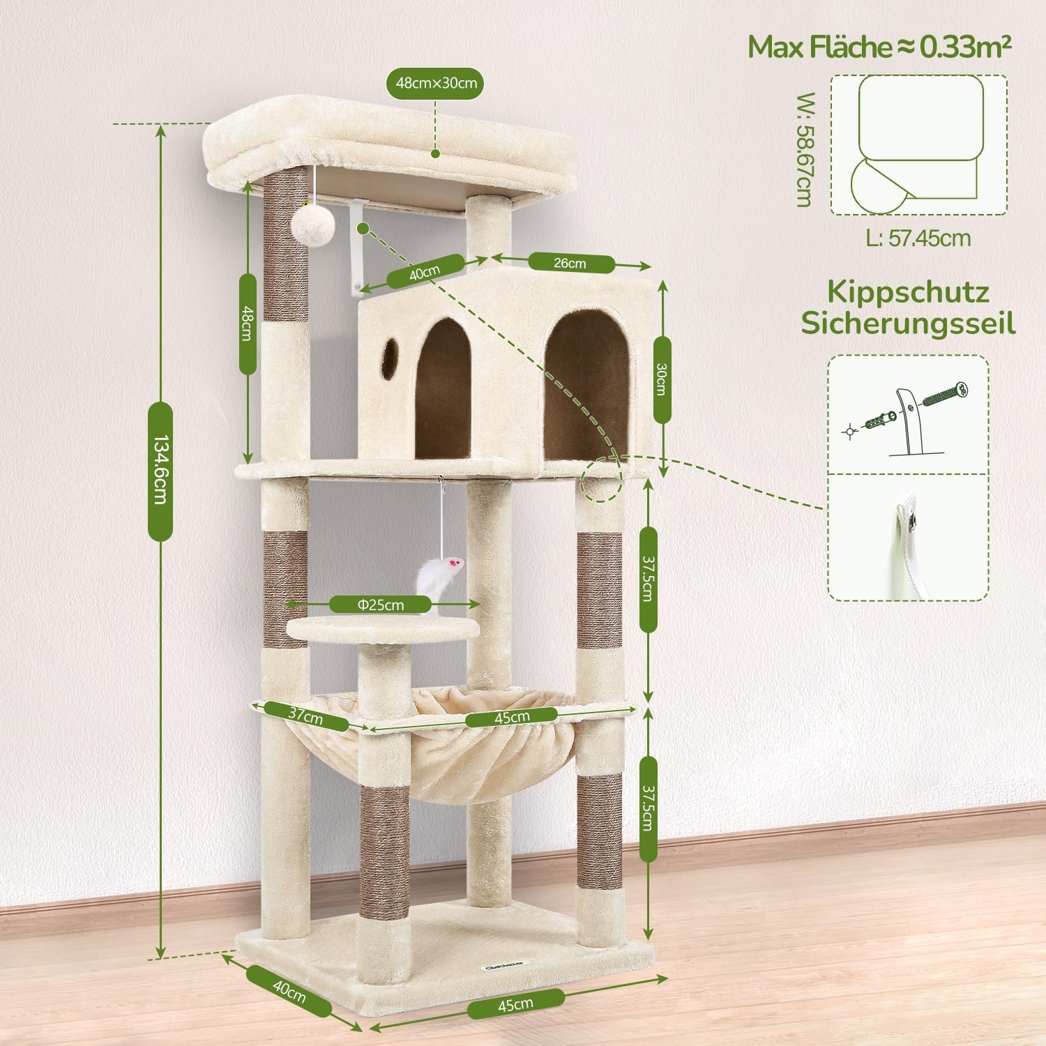 Extra große Plüsch-Hängematte: Der Kratzbaum wird mit einer extra großen Plüsch-Hängematte (48 x 40 cm) geliefert. Dank seiner weichen Oberfläche und großzügigen Innenausstattung ist er ein beliebter Liege- und Ruheplatz für Katzen.