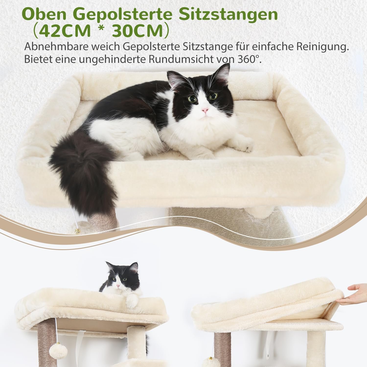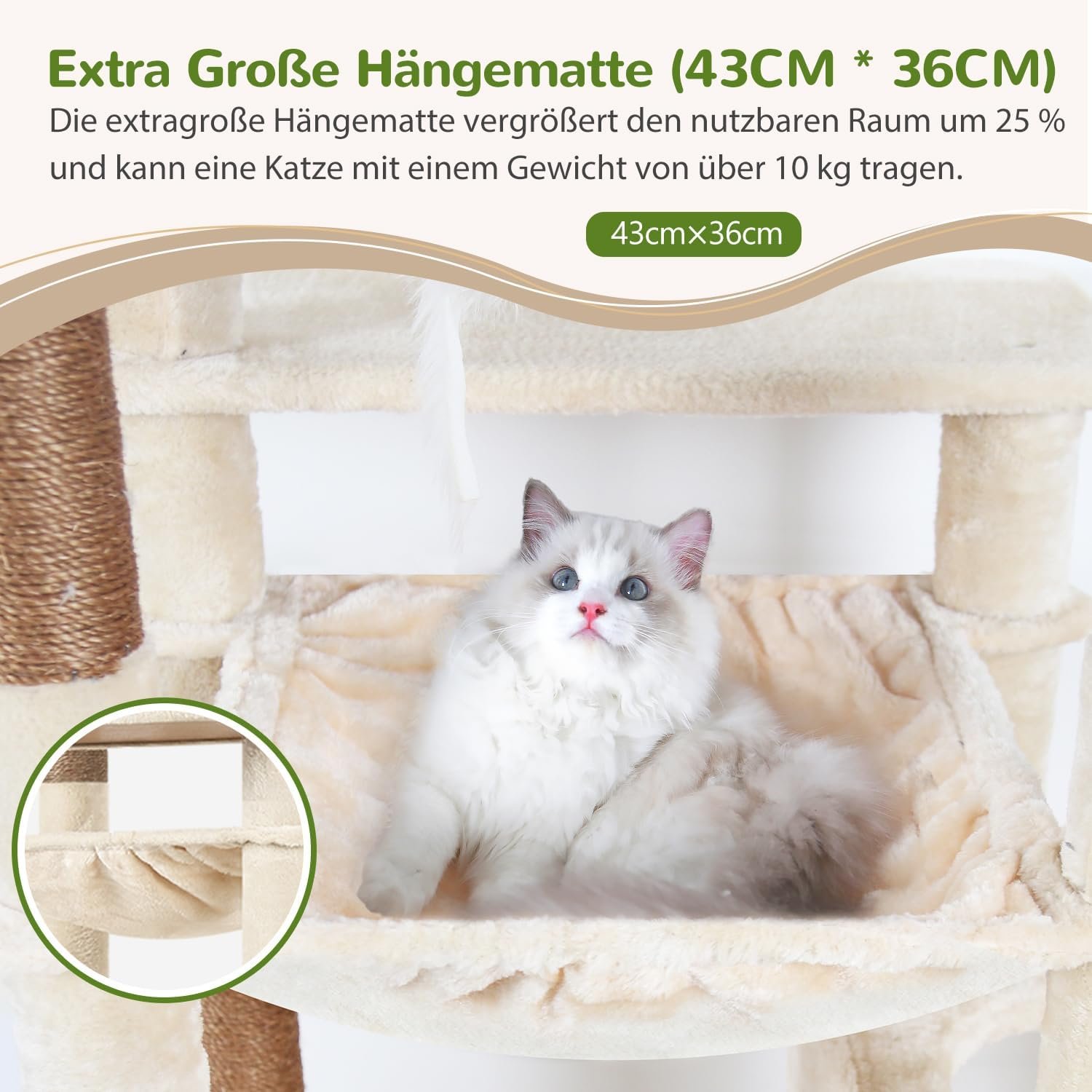 Große Hängematte für schwere Katzen: Der Kratzbaum wird mit einer großen Hängematte (43 cm x 36 cm) geliefert, die Nutzungsfläche vergrößert sich um 25 %. Die Ecken der stabilen Hängematte sind am dicken Stamm des Kratzbaums befestigt, sodass auch große Katzen mit einem Gewicht von über 5 kg sie nutzen können.