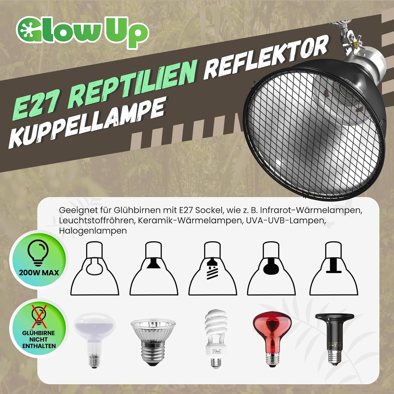 GlowUp 200 W E27 Reptilien-Lampenschirm mit EU-Stecker und Sicherheitsgitter