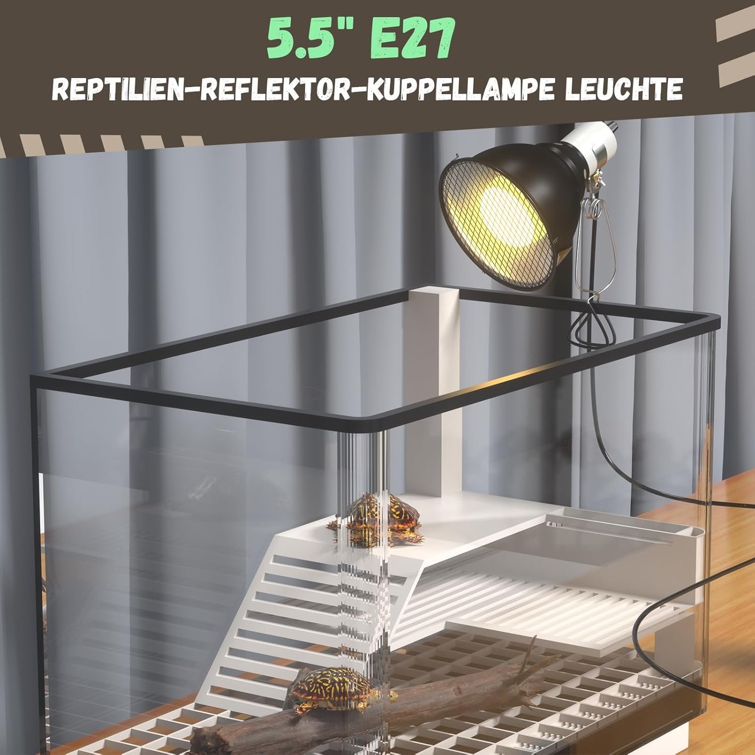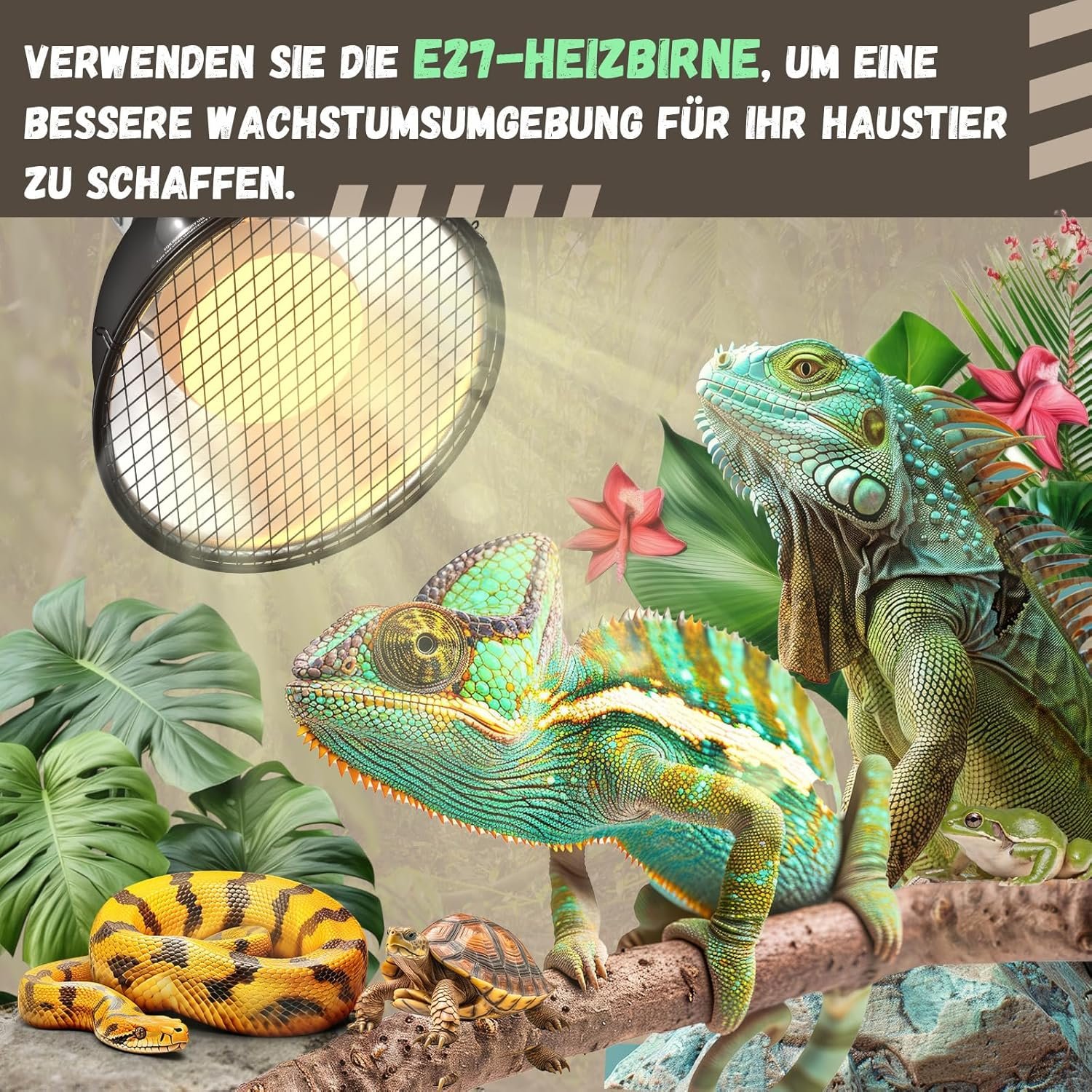 ERHÖHTE SICHERHEIT Dieses Kit ist jetzt mit einer Heizlampenabdeckung, einem EU-Stecker und einem Schutzgitter ausgestattet und bietet höchste Sicherheit. Das Gitter verhindert den direkten Kontakt mit der Lichtquelle und schützt Ihre Haustiere vor Verbrennungen.