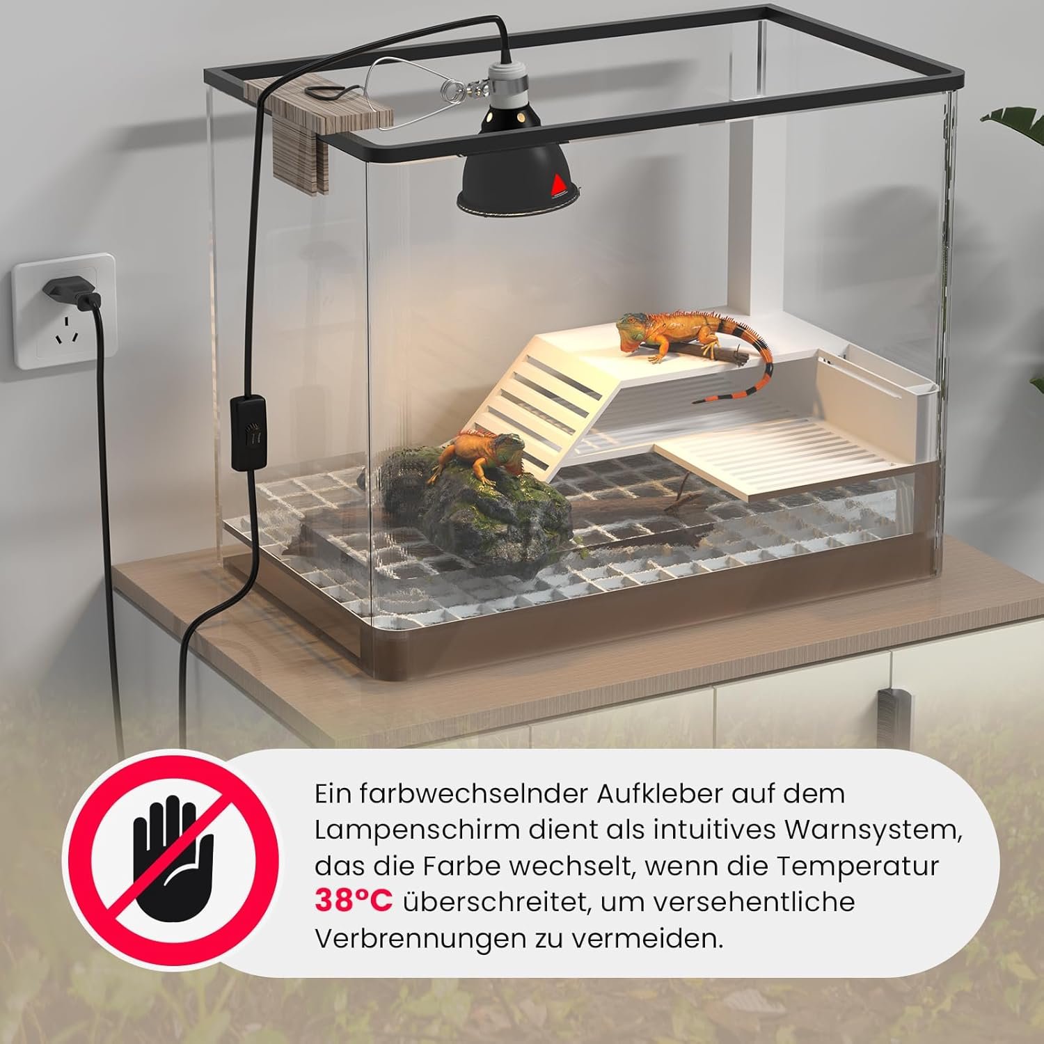Berühren Sie nicht die Oberfläche des Reptilien-Wärmelampenhalters, wenn der Aufkleber rot wird. ! !