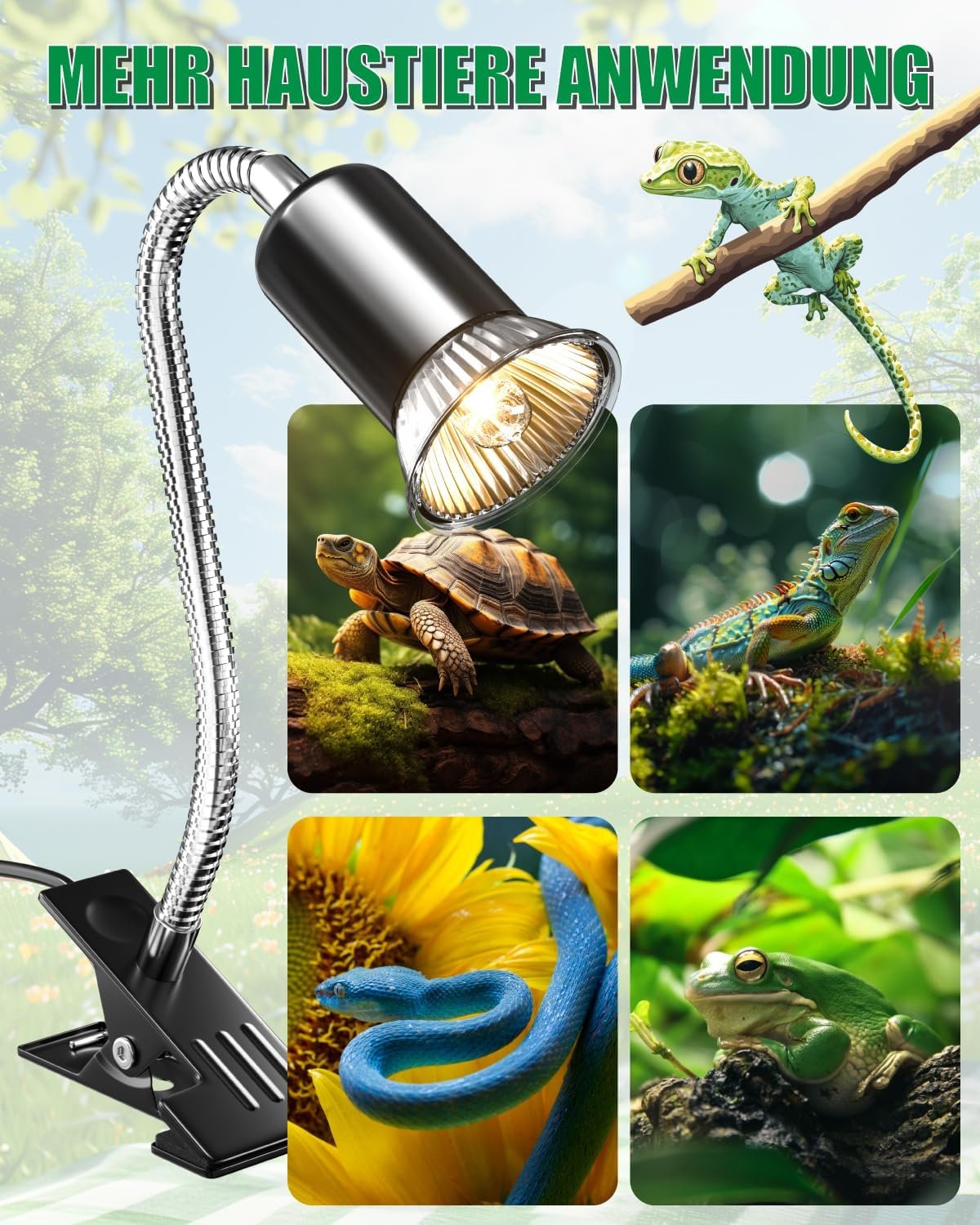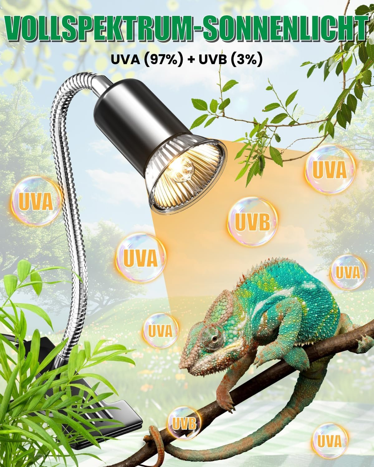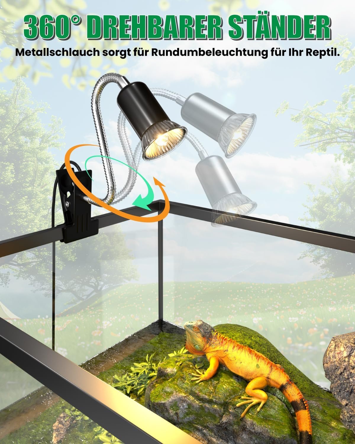 2er-Pack Reptilienlampen. Die Reptilienlampe verwendet ein spezielles Beschichtungsverfahren, um eine antioxidative und explosionssichere Leistung zu gewährleisten. Im Lieferumfang enthalten ist ein 2 x 50-W-Strahler, der Sonnenlicht simuliert und die erforderlichen ultravioletten Strahlen und Temperaturen liefert, um den natürlichen Wachstumsbedingungen Ihrer Reptilien gerecht zu werden