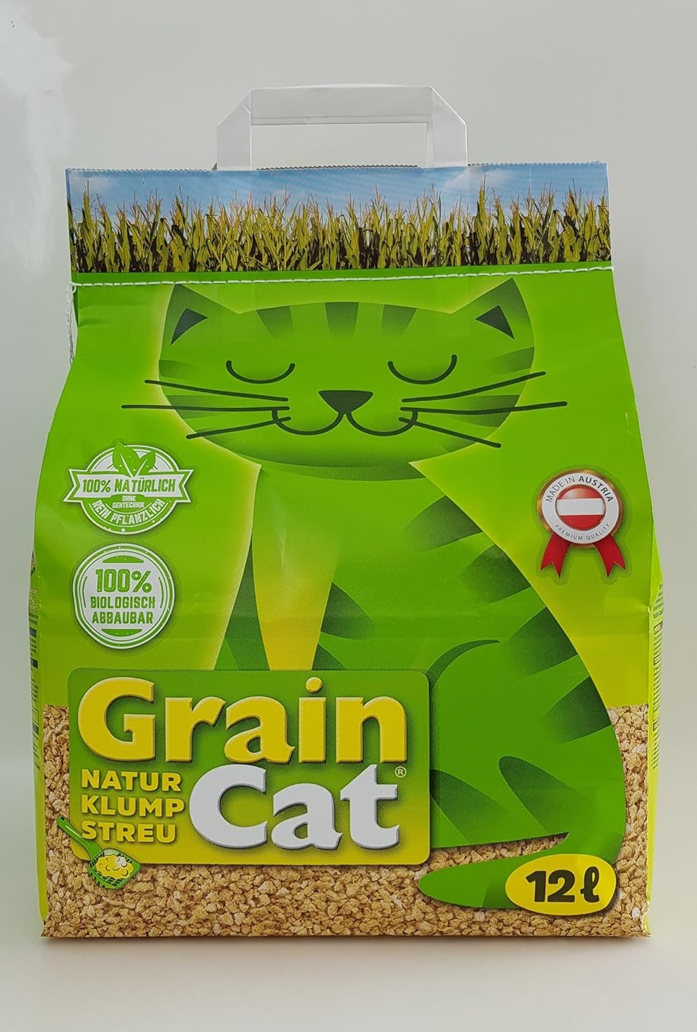 Graincat natürliches Klumpenstreu 2 x 12 Liter. Durch intensive Forschung wurde eine völlig neue klumpende Katzenstreu auf Basis nachwachsender Rohstoffe entwickelt, die unzählige Vorteile vereint. Die Produktion erfolgt ebenfalls am Firmenstandort in Hörsching. In mehreren Verarbeitungsschritten werden landwirtschaftliche, nachwachsende Rohstoffe (insbesondere Mais- und Getreidebruch) aus Österreich zu einem äußerst leichten Granulat verarbeitet, das über ein hervorragendes Wasseraufnahmevermögen bei guter Klumpwirkung verfügt. Eigenschaften: Getreide hat eine einzigartige mikroporöse Struktur, die eine große Fläche bietet, um Ammoniak effektiv einzufangen und zu absorbieren. Uringeruch wird auf natürliche Weise durch das Getreideprotein gebunden. Da ausschließlich pflanzliche Rohstoffe verwendet werden, ist das Produkt schnell biologisch abbaubar. Die entstehenden Klumpen zerfallen beim Spülen und können somit über die heimische Toilette entsorgt werden. Vorteile: saugfähiges, äußerst schonendes Granulat für Ihre Katze, schnelle und dauerhafte Geruchsbindung in den Klumpen, feste klumpende Klumpen, die über die Toilette entsorgt werden können, 100 % aus nachwachsenden, pflanzlichen Rohstoffen, 100 % biologisch abbaubar, bis zu zwei Drittel leichter als herkömmliche Klumpstreuprodukte, geringeres Abfallgewicht, geringe Staubentwicklung, einfache Handhabung und Reinigung für Ihre Katze und die Umwelt. Anwendung: 1) In die sorgfältig gereinigte, trockene Katzentoilette Graincat Eco Klumpstreu einfüllen, die Füllhöhe sollte 5 bis 6 cm betragen. 2) Das Graincat-Granulat nimmt Flüssigkeit sofort auf, es bilden sich feste Klumpen und Gerüche bleiben zurück. 3) Entsorgen Sie Klumpen und feste Abfälle täglich über die Toilette, die Biotonne oder den Hausmüll. 4) Füllen Sie die Menge der entfernten Klumpen mit Graincat-Granulat auf. 5) Entleeren Sie die Katzentoilette alle 2 bis 3 Wochen vollständig und reinigen Sie sie mit warmem Wasser