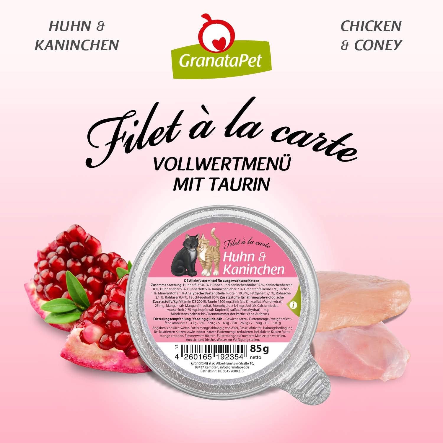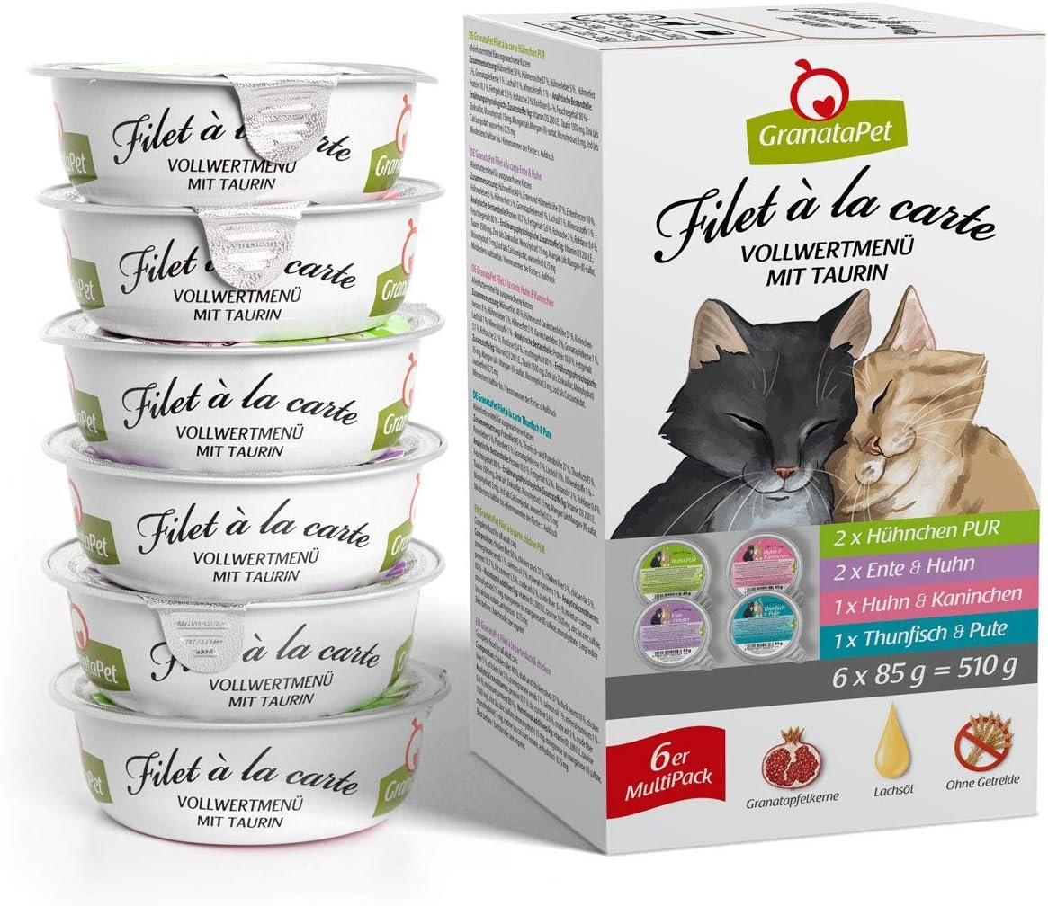 Lieferumfang: 6 x 85 g Filet à la carte, 2 x Huhn PUR, Ente & Huhn sowie 1 x Huhn & Kaninchen und Thunfisch und Pute, ausgewogenes Alleinfuttermittel für ausgewachsene Katzen. GranataPet.