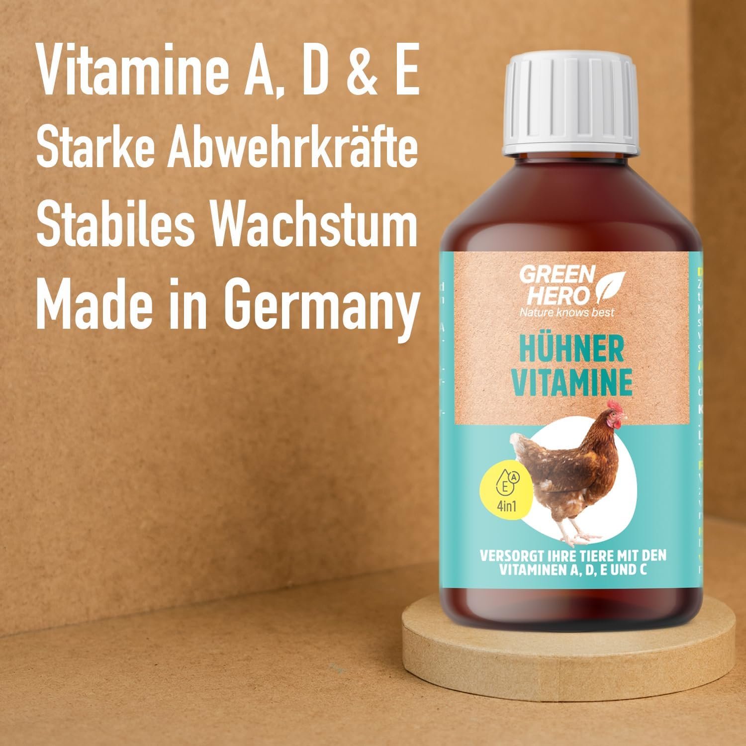 Besonders in der kalten Jahreszeit ist das Immunsystem von Hühnern und anderen Geflügelarten häufig geschwächt. Die Vitamine von Green Hero stärken das Immunsystem und halten Ihre Tiere gesund und leistungsfähig. Ideal zur Fütterung über das Trinkwasser oder als Zusatz zum Futter.