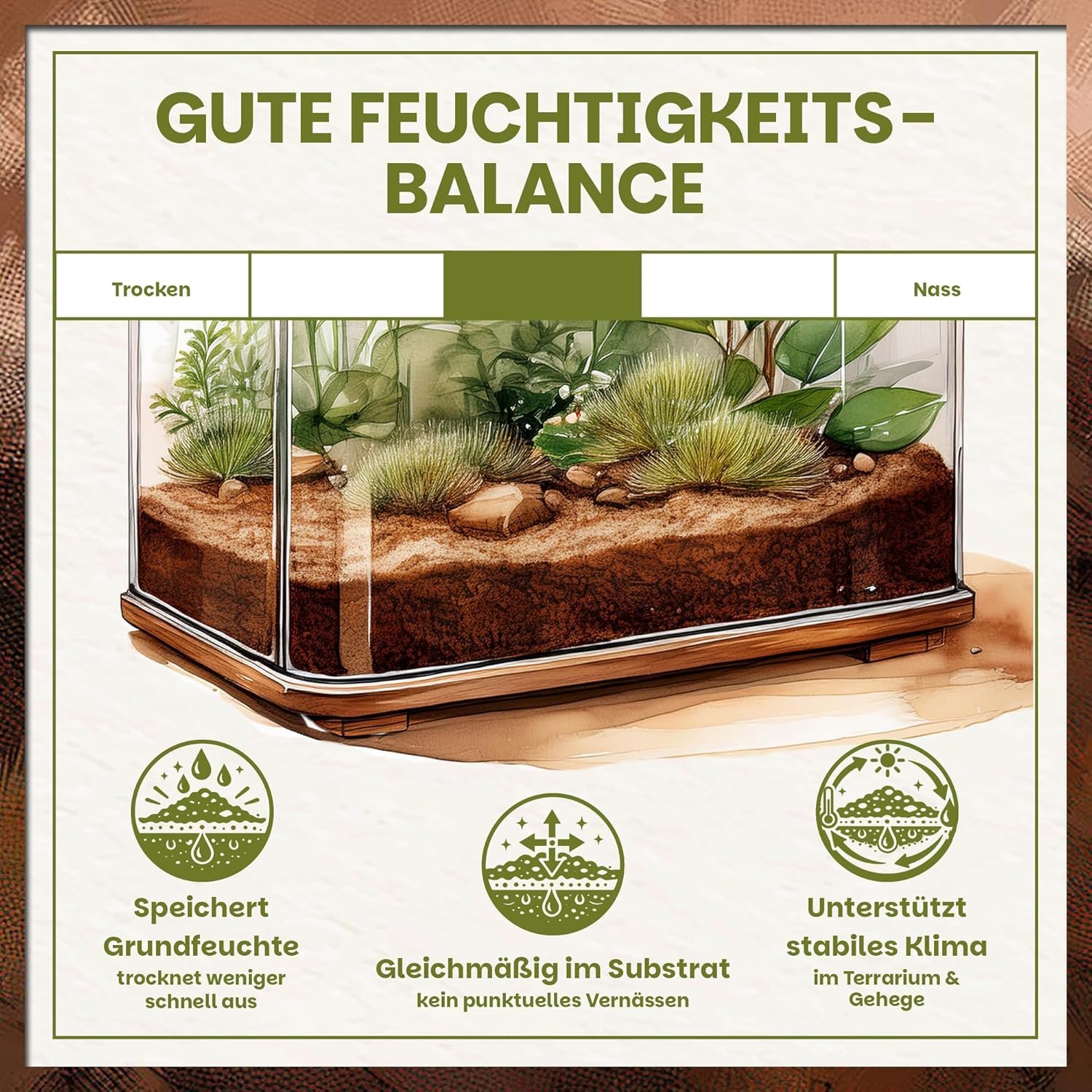 Optimale Feuchtigkeitsregulierung für stabiles Klima: Die ausgefeilte Substratstruktur sorgt für eine konstante Bodenfeuchtigkeit, ohne dass es zu Staunässe kommt. Perfekt für Frühbeetschildkröten, empfindliche Achatschnecken oder andere Tiere mit hohem Feuchtigkeitsbedarf. Die Terrarienerde bleibt länger nutzbar, reduziert Trockenphasen und sorgt für stabile Verhältnisse in Terrarien und Gehegen – auch bei wechselnden Temperaturen im Innen- und Außenbereich.