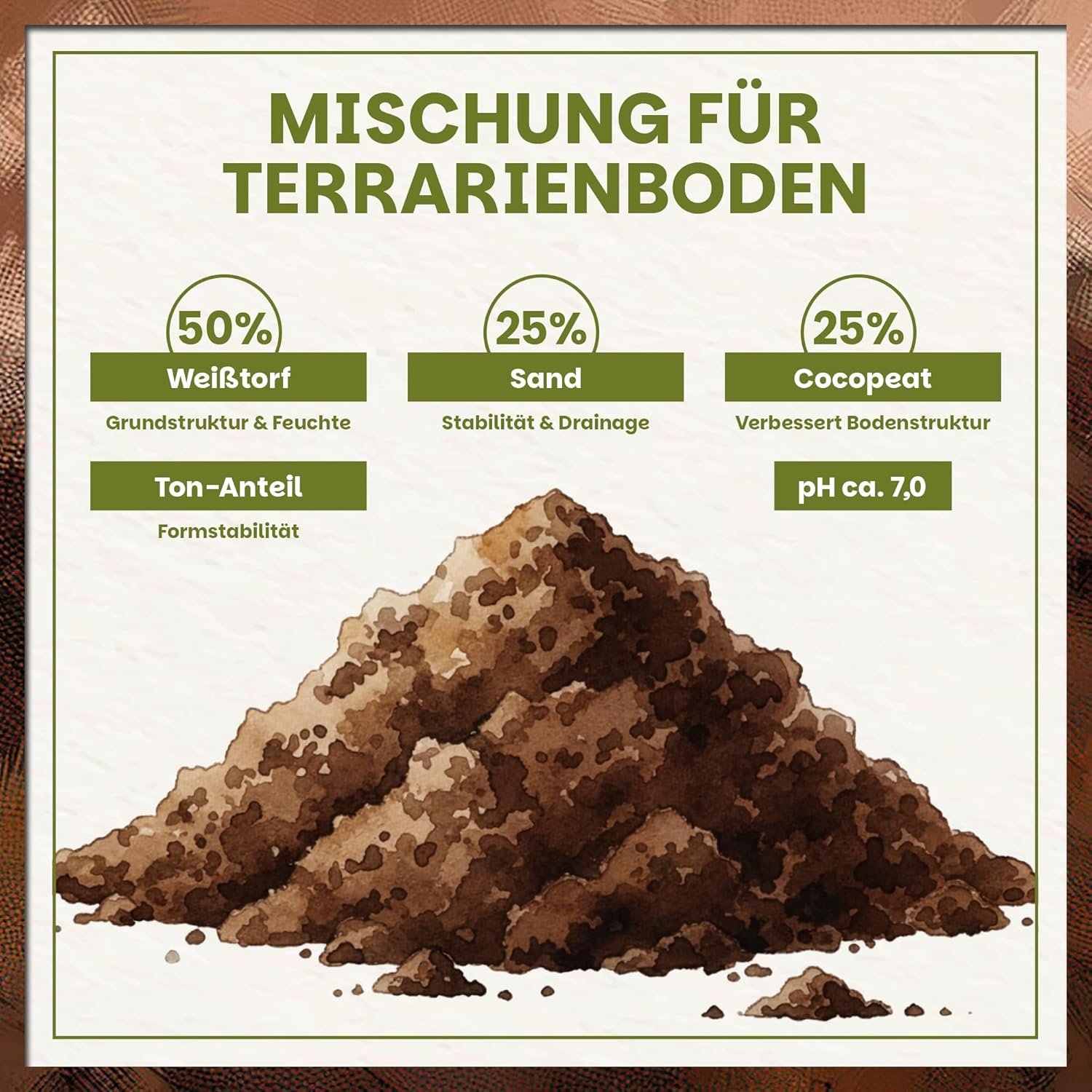 Die Zusammensetzung sorgt für optimale Bedingungen im Terrarium: 50 % Weißtorf bilden die Basis für Struktur und Feuchtigkeit, 25 % Sand sorgen für Stabilität und gute Drainage. 25 % Kokostorf verbessern die Bodenstruktur und speichern zusätzlich Feuchtigkeit. Der Tonanteil erhöht die Formstabilität, auch im feuchten Zustand. Mit einem pH-Wert von ca. 7,0 ist das Substrat besonders für empfindliche Reptilienarten geeignet.