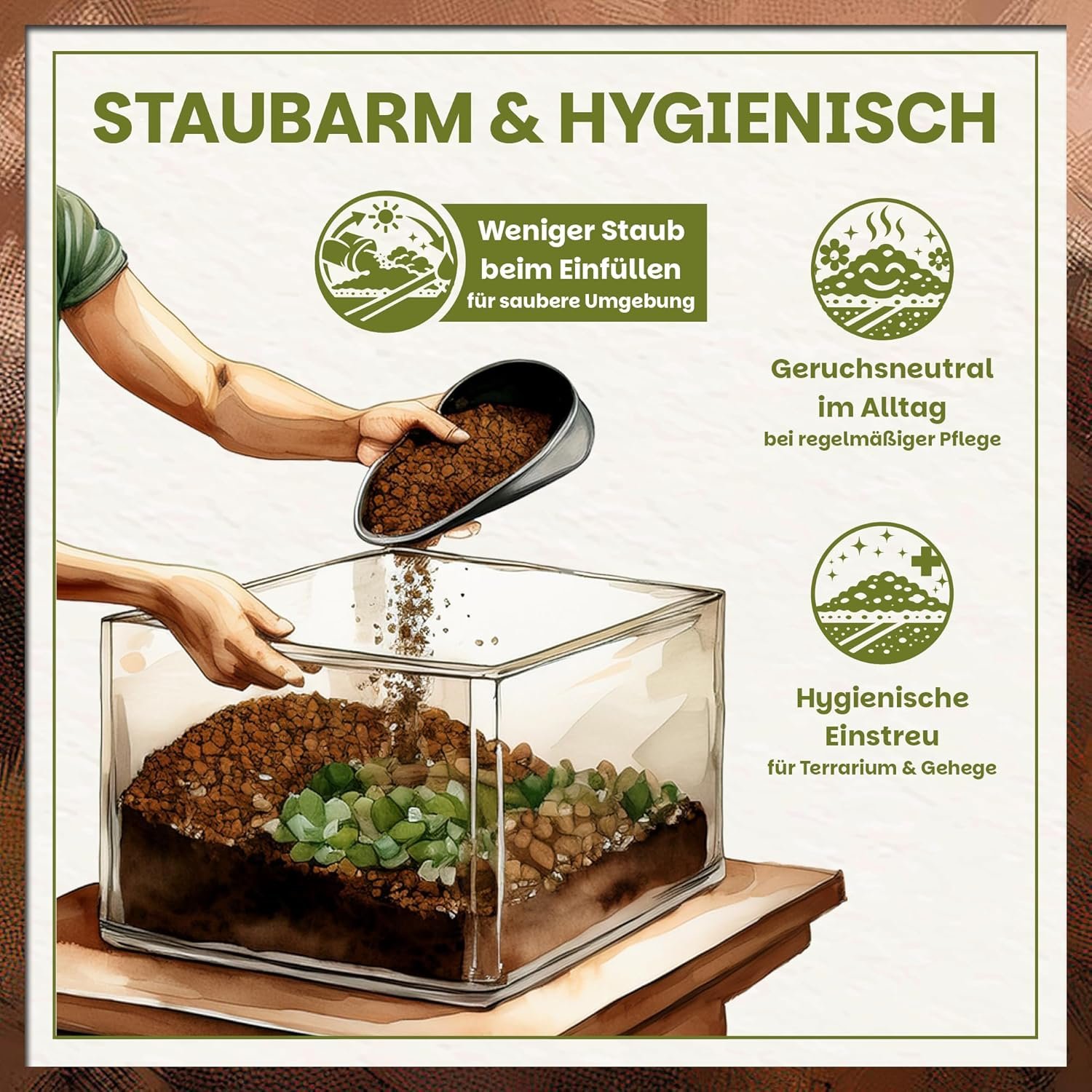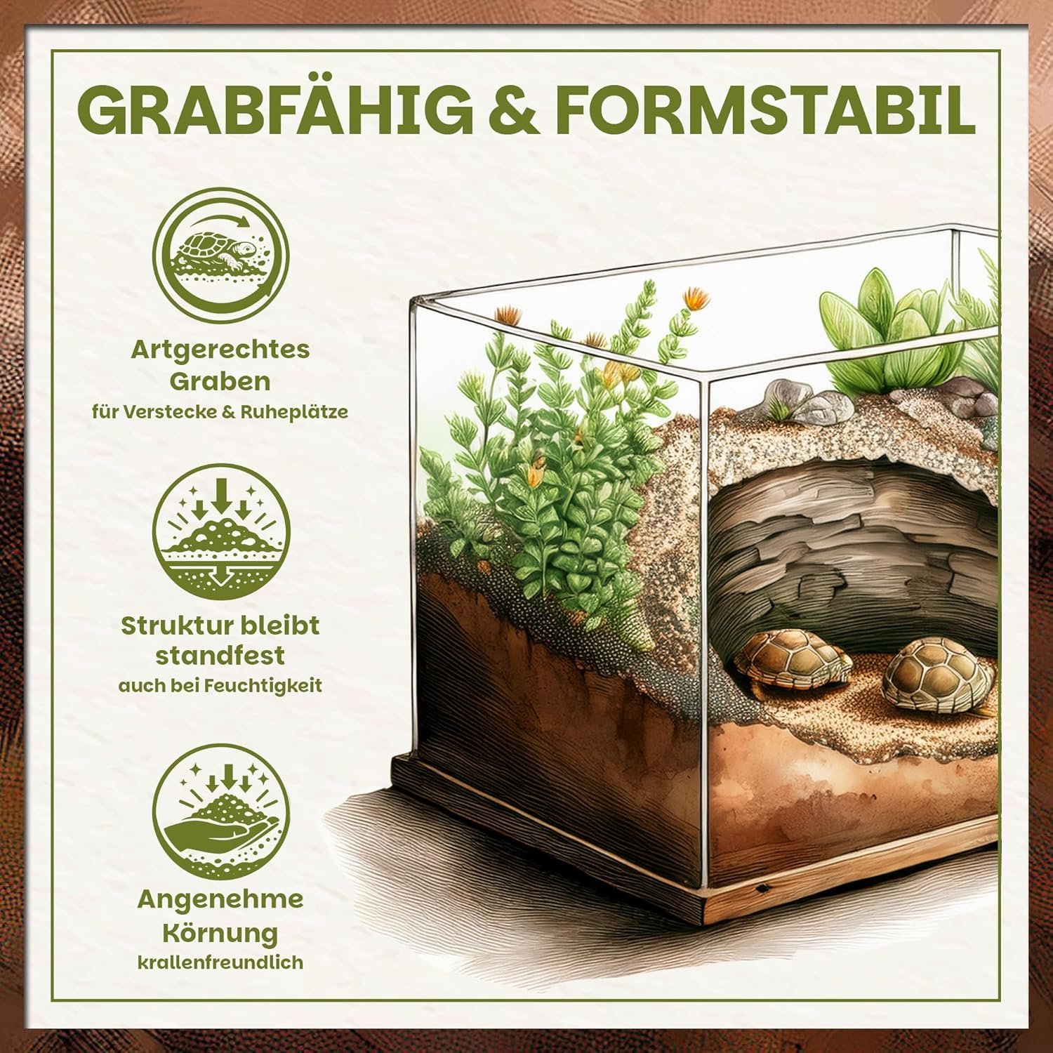 Natürliches Substrat für Schildkröten, Reptilien und Schnecken: strukturstabil, grabfähig und hautschonend. Fördert artgerechtes Verhalten wie Graben, Eiablage und Rückzug. Kann direkt für Terrarium, Frühbeet oder Innengehege verwendet werden – ohne Zusatzstoffe oder Chemikalien.