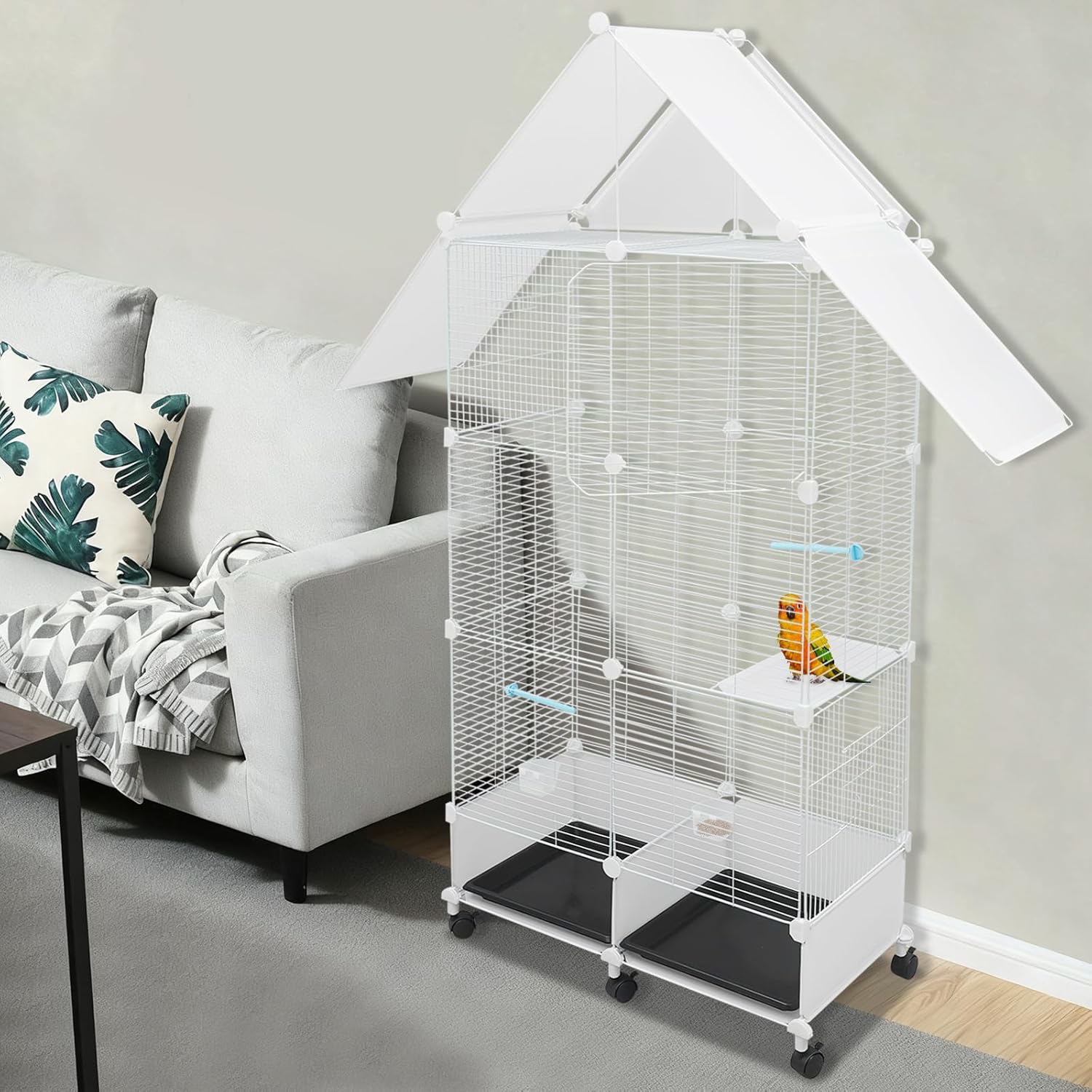 Überdachtes Design: Es verfügt über eine große Haupttür zum einfachen Füttern der Vögel sowie zwei kleine Seitentüren, die die Wahrscheinlichkeit des Entkommens von Vögeln verringern, und kann auch mit Geräten wie Brutkästen und Vogeltränken (nicht im Lieferumfang enthalten) verbunden werden, was der täglichen Vogelpflege mehr Übung verleiht.