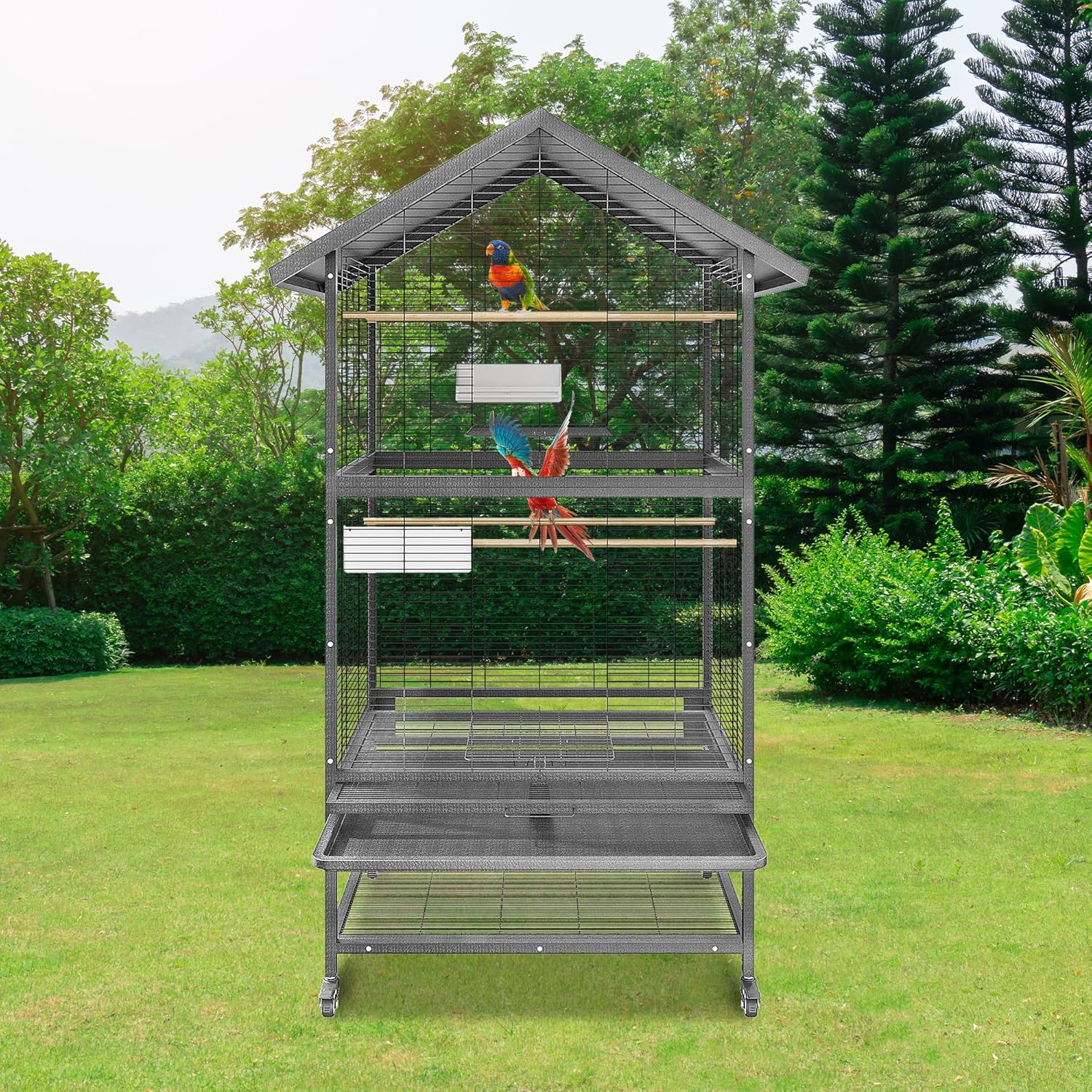 XXL-Vogelkäfig, leicht zu bewegen und stabil. Design: Die arretierbaren Rollenfüße ermöglichen ein einfaches Bewegen des Käfigs. Die Hammerschlagoptik in Silber-Anthrazit sorgt für einen stilvollen Look. Ob als Käfig für Wellensittiche, für Alexandersittiche, kleine Papageien oder Zebrafinken – dieses Modell überzeugt durch Funktionalität und Design.