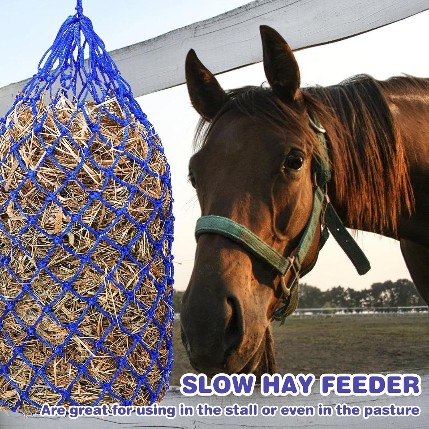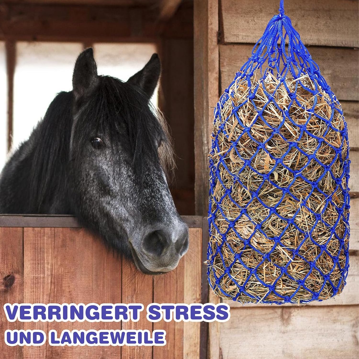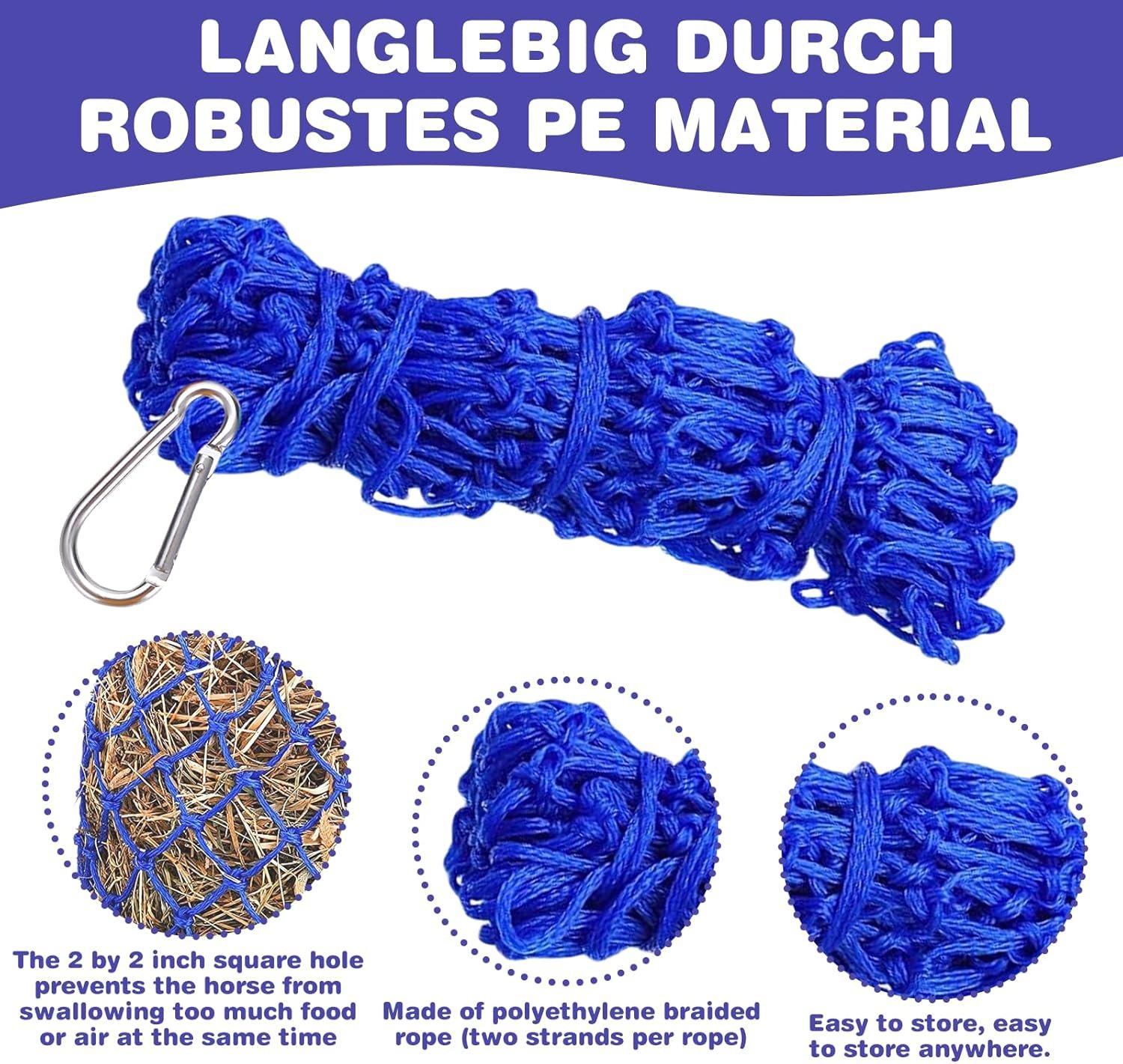 Stilvolles Design: Das große Heunetz für Pferde ist in einem schönen Blauton gehalten, der nicht nur funktional, sondern auch ästhetisch ansprechend ist. Es verleiht Ihrem Pferdestall einen Hauch von Farbe und Stil und sorgt gleichzeitig dafür, dass Ihr Pferd immer gut versorgt ist.