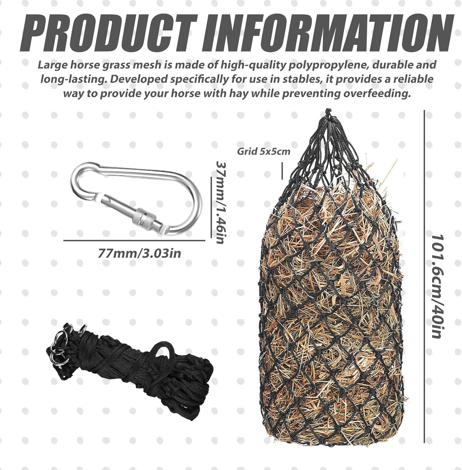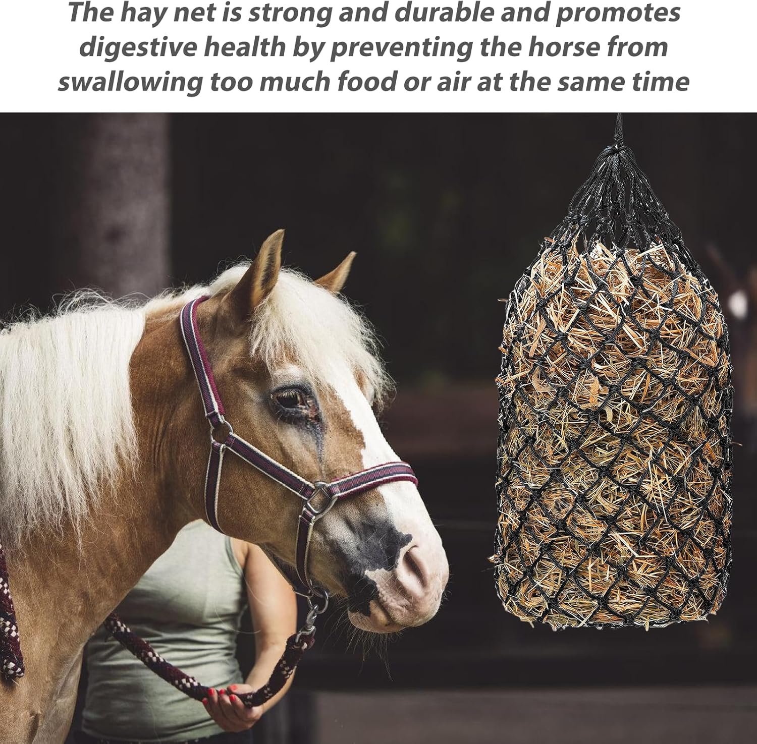 Das Heunetz für Pferde groß für Pferde besteht aus strapazierfähigem Material, das dem täglichen Gebrauch standhält und eine lange Lebensdauer gewährleistet.