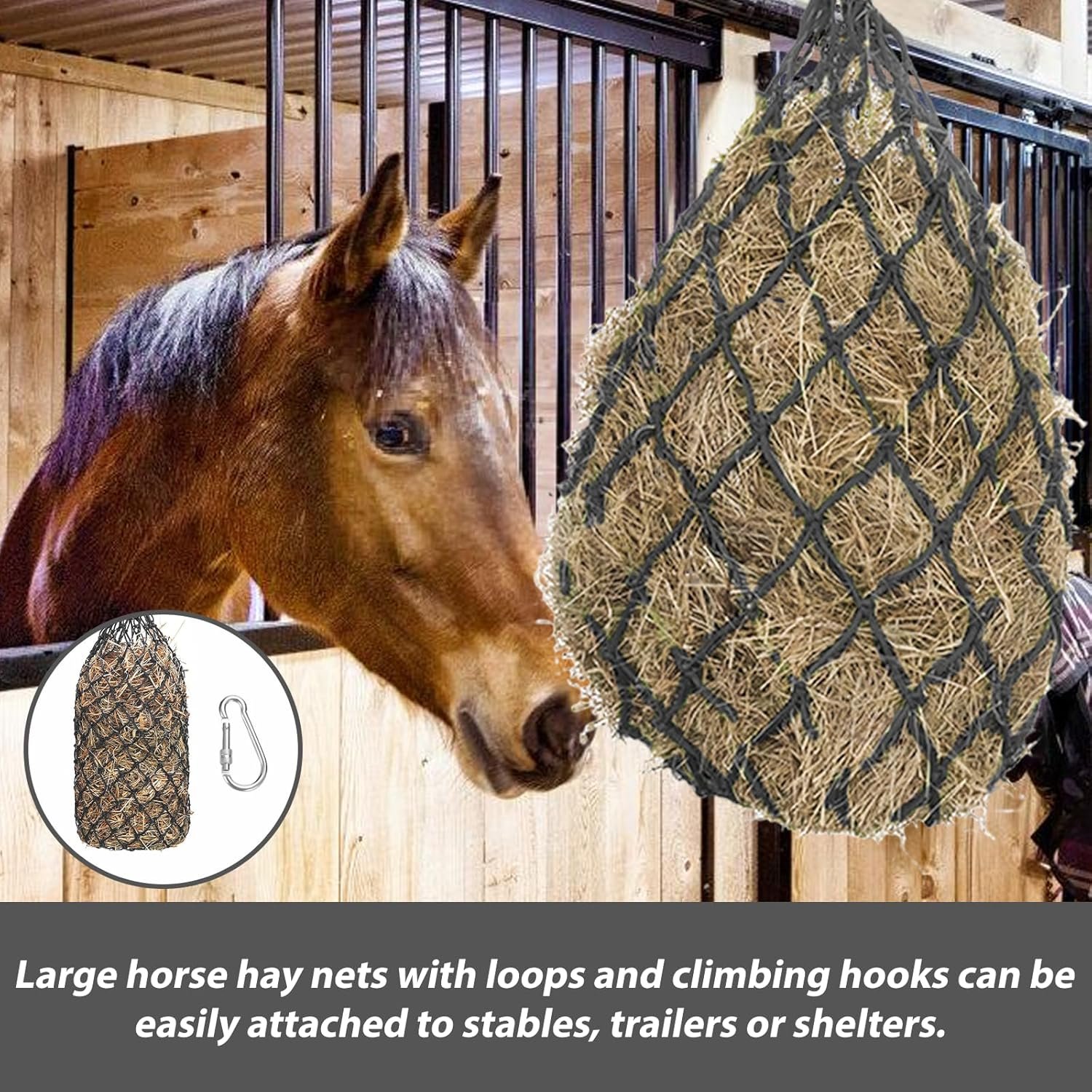 Ausgestattet mit stabilen Ringen lässt sich das große Heunetz für Pferde einfach an verschiedenen Stellen im Stall oder auf der Weide befestigen, was Flexibilität und Komfort bietet.