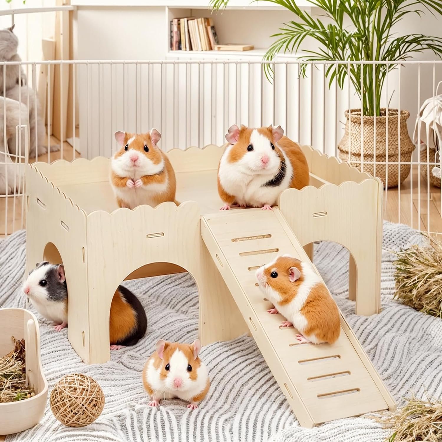 Meerschweinchenhaus mit Rampe: Das Meerschweinchenschloss ist mit vier Türen ausgestattet, die nicht nur für eine gute Luftzirkulation sorgen, sondern auch den Erkundungsspaß erhöhen. Es kann für 2–4 Meerschweinchen zum Verstecken, Ausruhen und Erkunden genutzt werden.