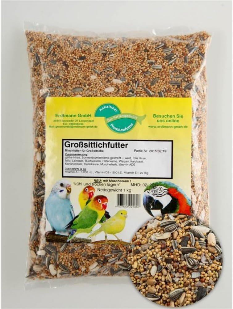 Anhaltiner Großsittichfutter ist ein Mischfutter für Großsittiche. Die hochwertige Mischung verschiedenster Samen ist ein willkommenes Mischfutter für unsere gefiederten Freunde. Zusammensetzung: Gelbe Hirse, Sonnenblumenkerne, Streifenhirse, Rote Hirse, Milo, Leinsamen, Buchweizen, Haferkerne, Weizen, Cardisaat, Kanariensaat, Hafersamen, Muschelkalk, Vitamin-ADE-Zusätze pro kg: Vitamin A = 5.000 iE Vitamin D3 = 500 IE. Vitamin E = 20 mg. Sorgen Sie immer für frisches Trinkwasser. An einem kühlen und trockenen Ort aufbewahren.