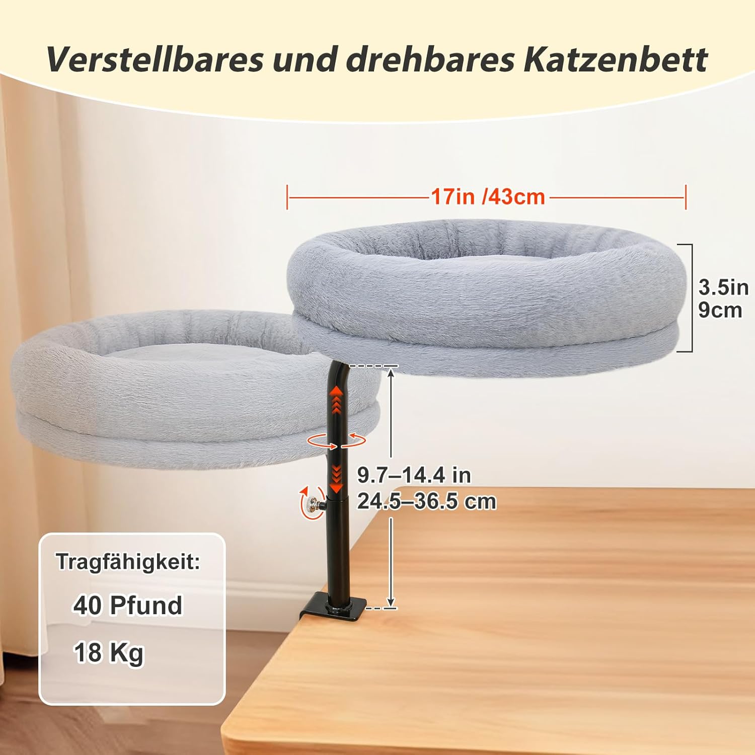360-Grad-Drehung und Höhenverstellung Dieses Katzenschreibtischbett ist um 360° drehbar und höhenverstellbar, sodass Sie es genau so positionieren können, wie es Ihre Katze bevorzugt. Egal, ob sie ein ruhiges Nickerchen machen oder Vögel am Fenster beobachten möchte – das vollständig verstellbare Design passt sich sofort an
