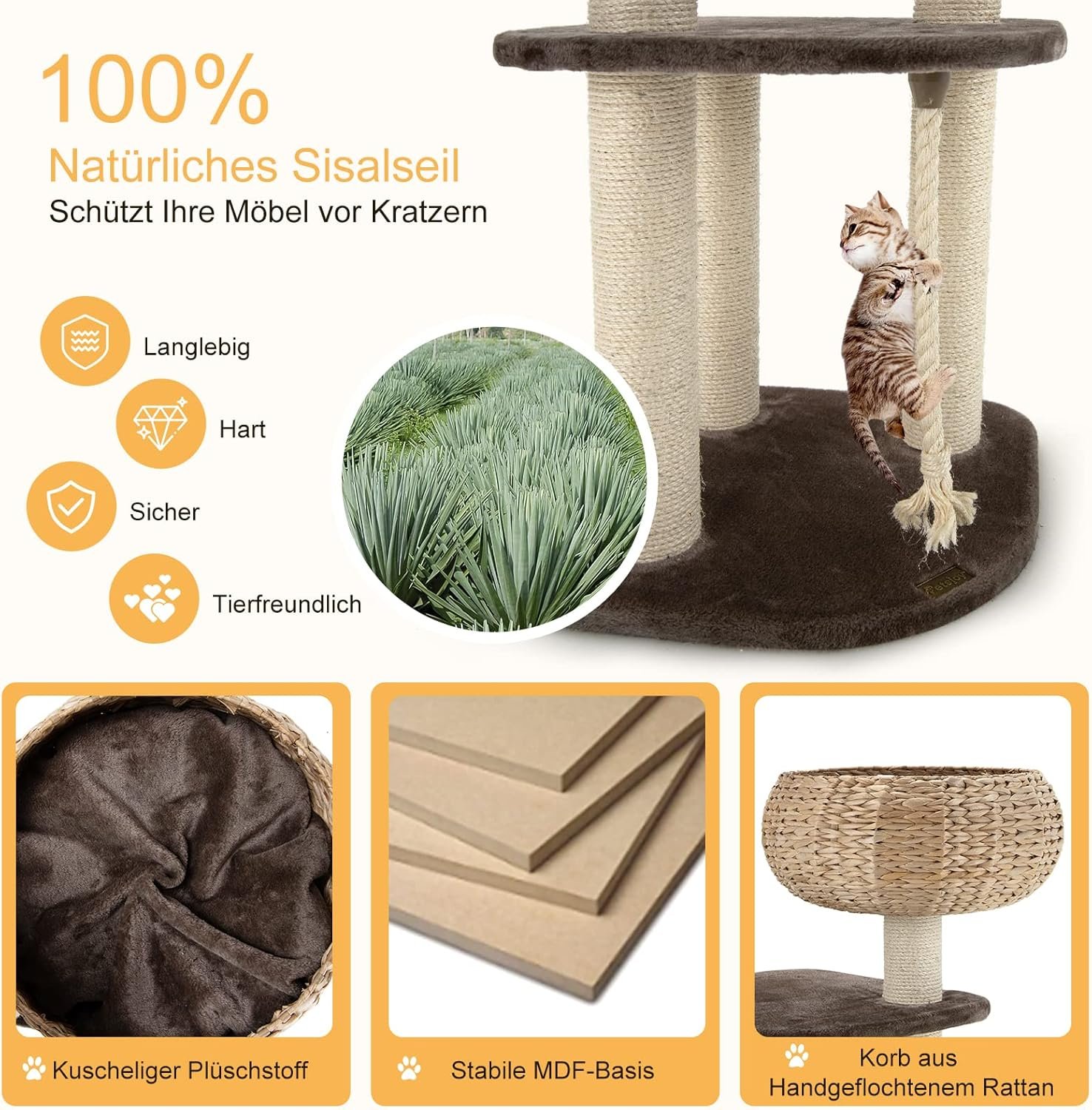 Sisalstämme zum Kratzen: Die von einem natürlichen Sisalseil umgebenen Pfosten bieten Ihrer Katze einen geeigneten Platz zum Krallenwetzen. Dadurch bleiben die Krallen der Katze gesund und Ihre Möbel werden nicht von Ihrer Katze zerkratzt. Das Sisalseil erhöht außerdem die Reibung, sodass Katzen auf- und absteigen können.